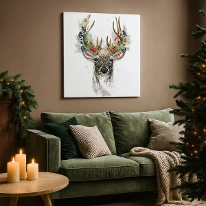 - L'impression sur toile « En tenue de Noël » représente un cerf stylisé avec des bois décoratifs sur fond blanc. Une décoration parfaite pour un intérieur harmonieux et une ambiance festive.