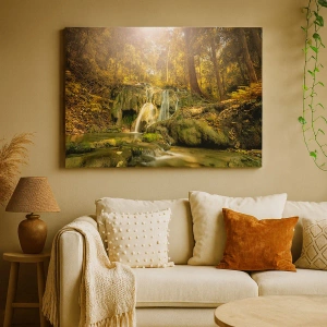Impression sur toile - Image sur toile - Une cascade forestière sous les rayons du soleil, entourée de verdure - 70x50cm - Cascade de forêt en vert - Décoration murale moderne pour le salon et la chambre ARTTOR