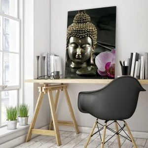 Impression sur verre - Image sur verre - Une statuette de Bouddha avec une orchidée et des baguettes sur un fond de pierres - 80x120cm - Harmonie de la sagesse et de la beauté - Décoration murale moderne pour le salon et la chambre ARTTOR