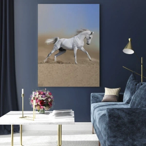 Impression sur verre - Image sur verre - Un cheval blanc galopant sur le sol sablonneux - 120x80cm - Le plus beau conte de fées arabe - Décoration murale moderne pour le salon et la chambre ARTTOR