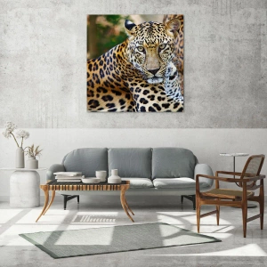 Impression sur verre - Image sur verre - Jaguar au repos dans un environnement naturel avec un fond vert. - 80x120cm - Sauvage et calme - Décoration murale moderne pour le salon et la chambre ARTTOR