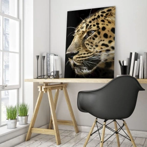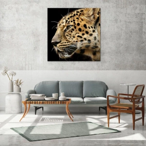 Impression sur verre - Image sur verre - Profil d'un léopard sur fond noir - 120x80cm - Calme, concentré, prêt - Décoration murale moderne pour le salon et la chambre ARTTOR