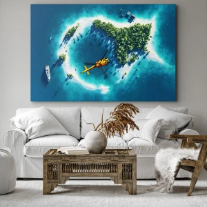 - Ce tableau représente une île tropicale entourée d'eau turquoise, avec un hélicoptère visible. Idéal pour les intérieurs inspirés par l'exotisme et l'atmosphère de vacances. Dimensions : 70 x 50 cm.