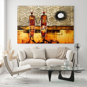 Impression sur verre - Image sur verre - Une paire de figures abstraites sur fond de motifs dorés et d'un paysage. - 70x100cm - Composition ethnique aux couleurs de l'Afrique - Décoration murale moderne pour le salon et la chambre ARTTOR