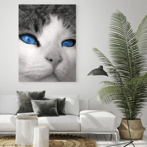 Impression sur verre - Image sur verre - Une photo en noir et blanc d'un chat aux yeux bleus intenses. - 120x80cm - Yeux bleus inhabituels - Décoration murale moderne pour le salon et la chambre ARTTOR