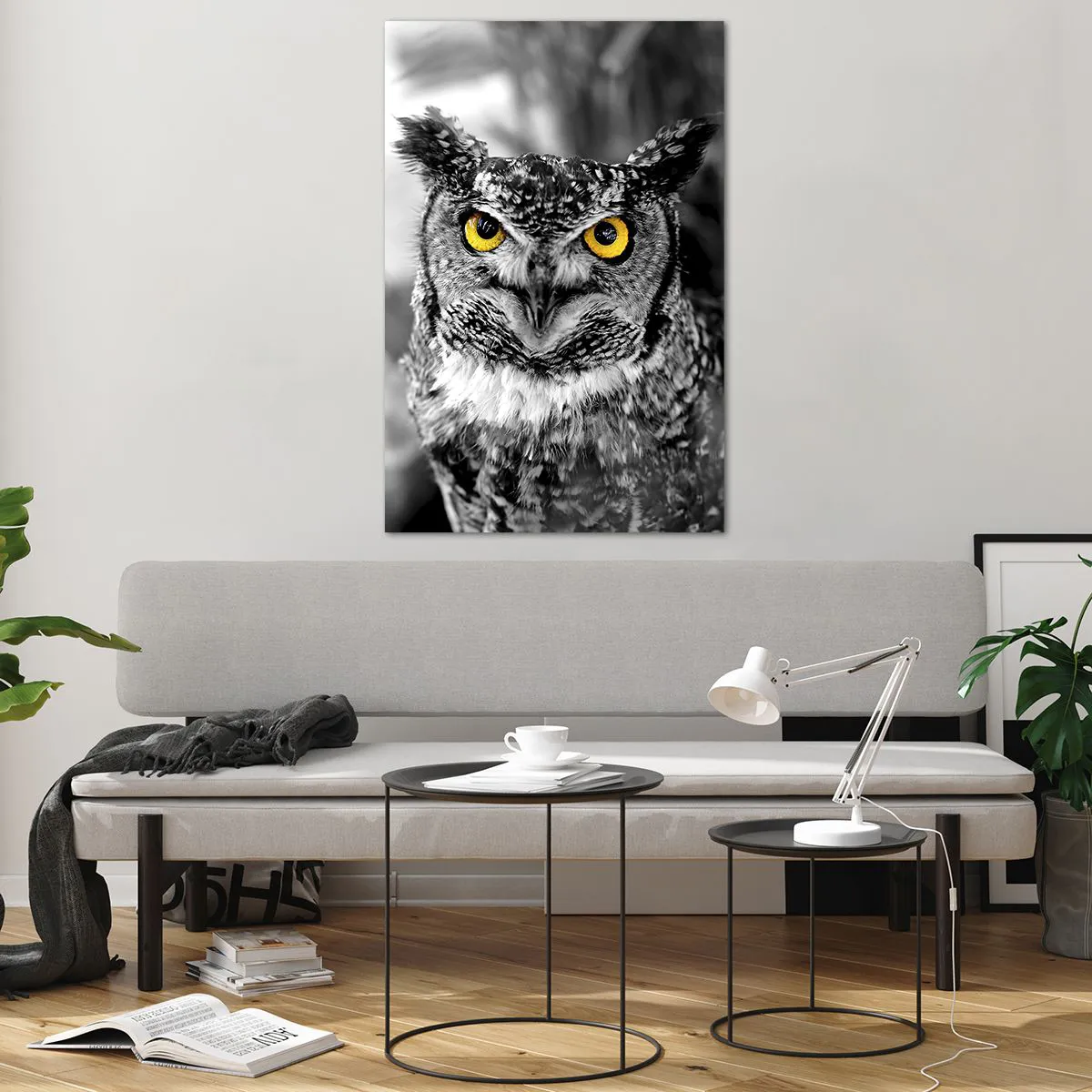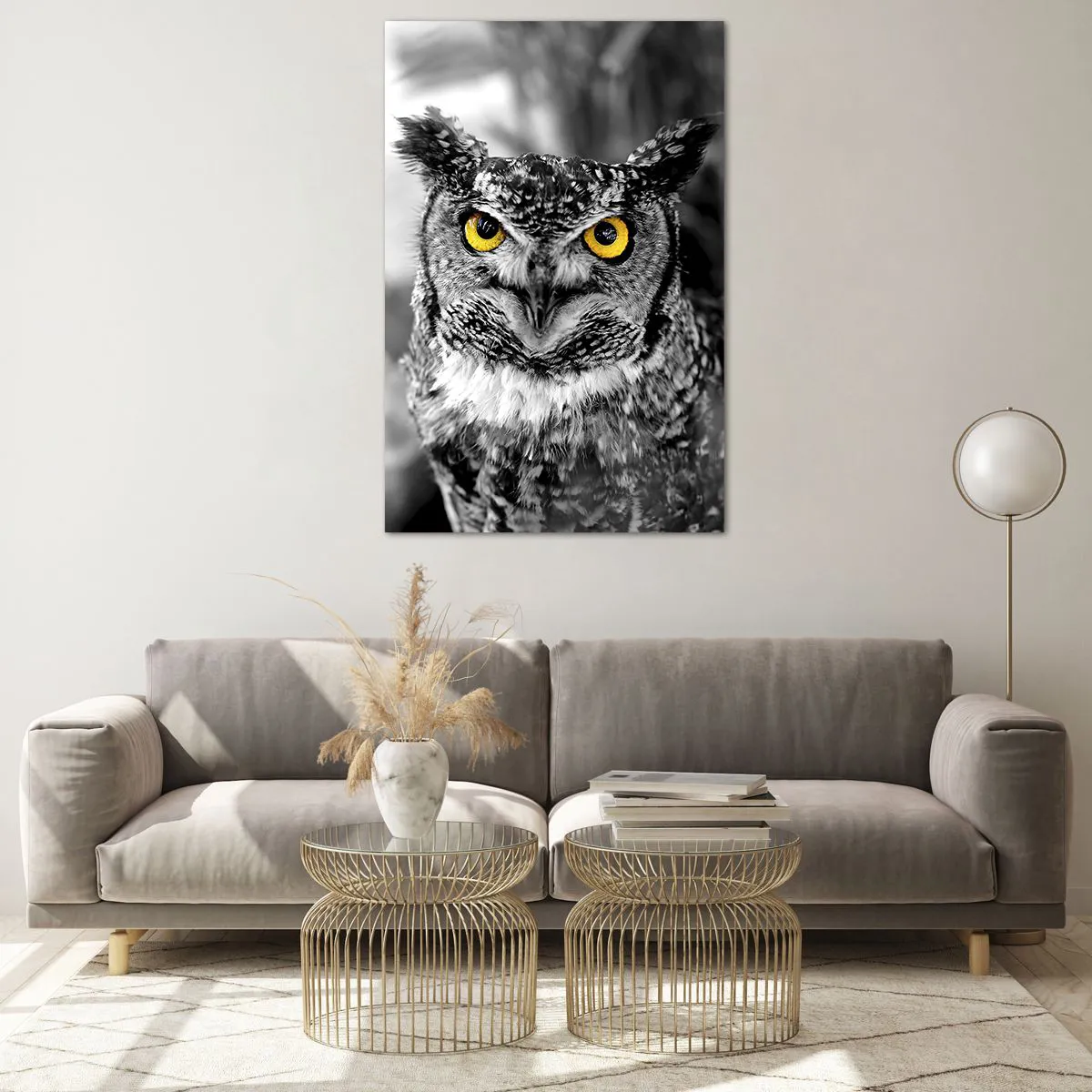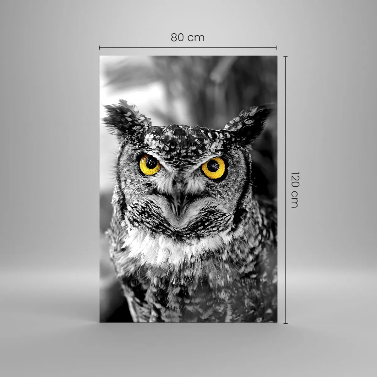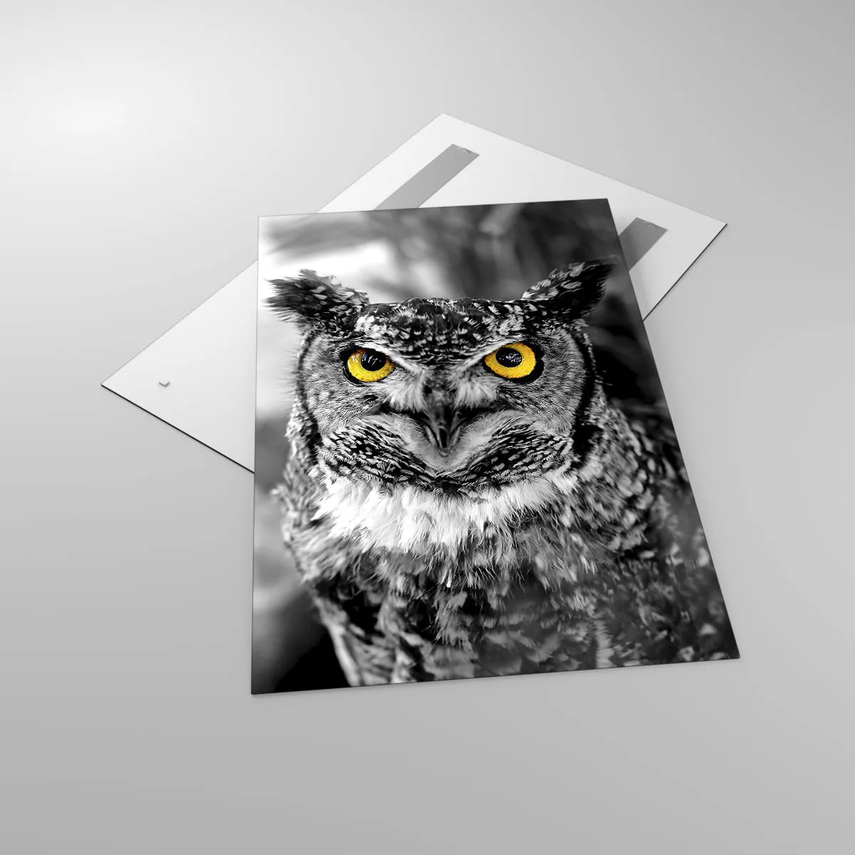 Impression sur verre - Image sur verre - Une photo en noir et blanc d'un hibou aux yeux jaunes - 80x120cm - Rien ne se cachera - Décoration murale moderne pour le salon et la chambre ARTTOR