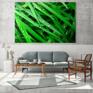 La peinture sur verre est faite sur un verre de 4 mm d'épaisseur. Les bords du verre ont une arête trapézoïdale mate. La tableau est sûr à l'utilisation et prêt à être accroché - il a des crochets en métal attachés à l'arrière du cadre et des entretoises en mousse permettant la régulation uniforme de la distance du tableau au mur.