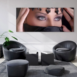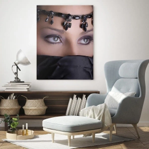 Impression sur verre - Image sur verre - Le visage d'une femme avec un diadème orné et un regard intense - 50x70cm - Tentation de mystère oriental - Décoration murale moderne pour le salon et la chambre ARTTOR