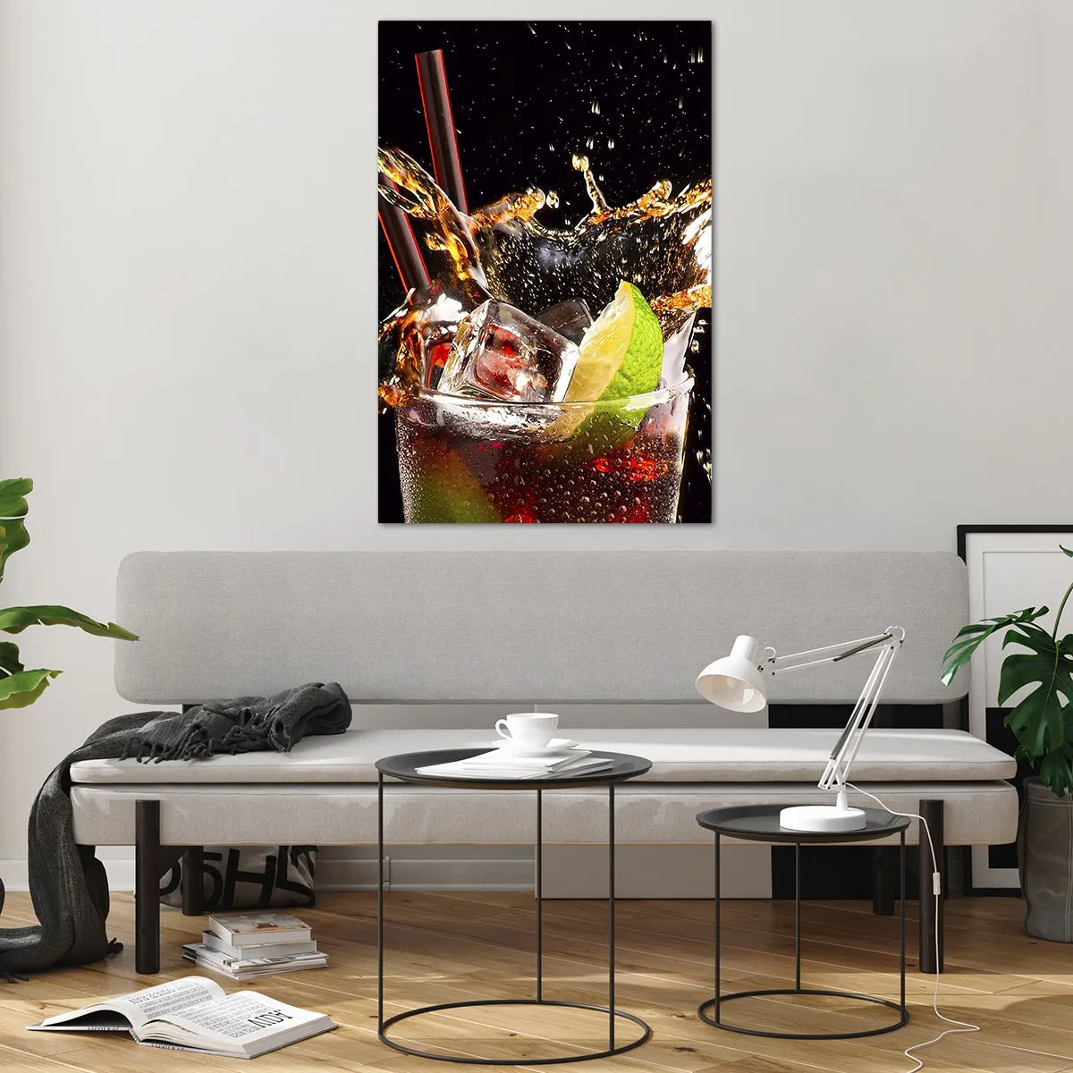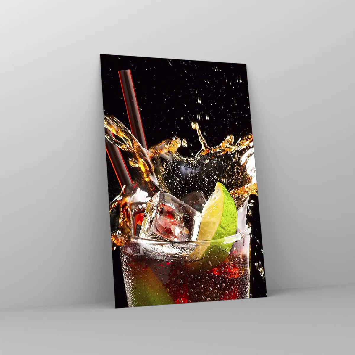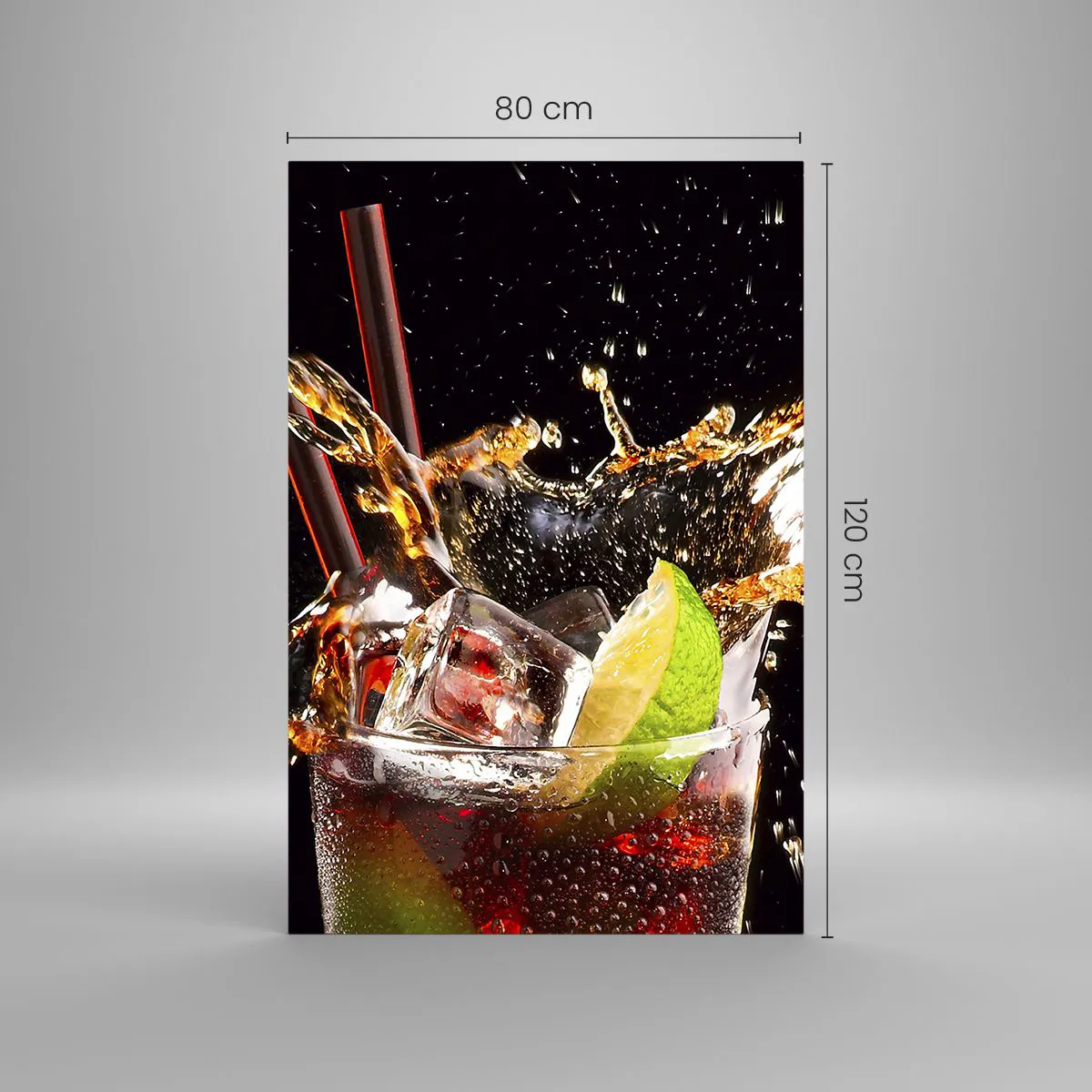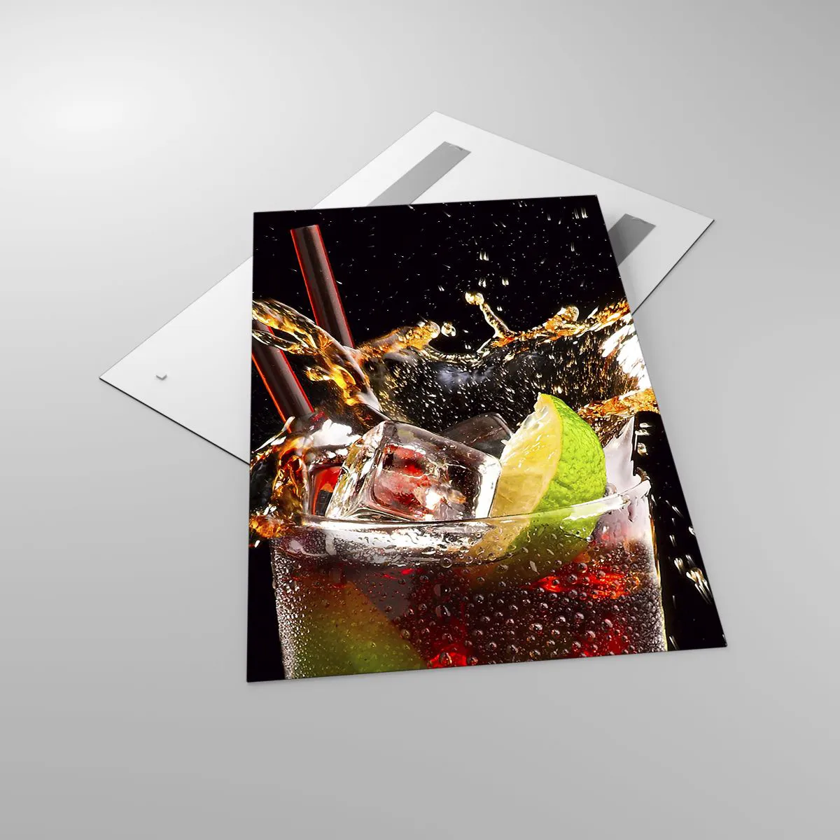 Impression sur verre - Image sur verre - Un verre de boisson, citron vert et glace au moment des éclaboussures dynamiques - 80x120cm - Joie et énergie des couleurs - Décoration murale moderne pour le salon et la chambre ARTTOR