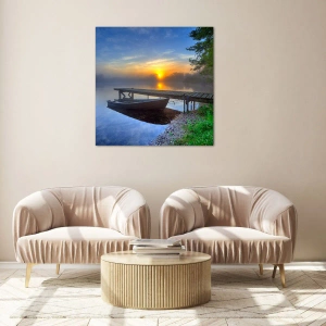 Impression sur verre - Image sur verre - Une jetée au bord du lac au lever du soleil avec un bateau sur le rivage - 70x100cm - Comment l'ordinaire se transforme en magie - Décoration murale moderne pour le salon et la chambre ARTTOR