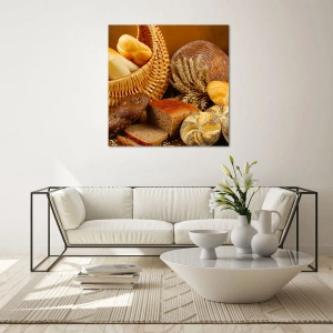 Impression sur verre - Image sur verre - Différents pains dans un panier en osier sur fond doré - 140x50cm - On s'en est encore sorti - Décoration murale moderne pour le salon et la chambre ARTTOR