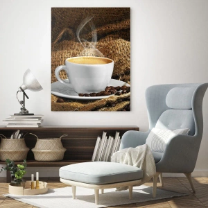 Impression sur verre - Image sur verre - Une tasse de café avec des grains sur un fond de jute - 50x70cm - L'odeur du moka et la densité du miel liquide - Décoration murale moderne pour le salon et la chambre ARTTOR