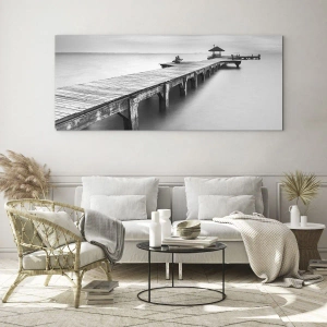 Impression sur verre - Image sur verre - Une vue en noir et blanc d'une jetée en bois sur une eau calme. - 120x50cm - À l'horizon - Décoration murale moderne pour le salon et la chambre ARTTOR