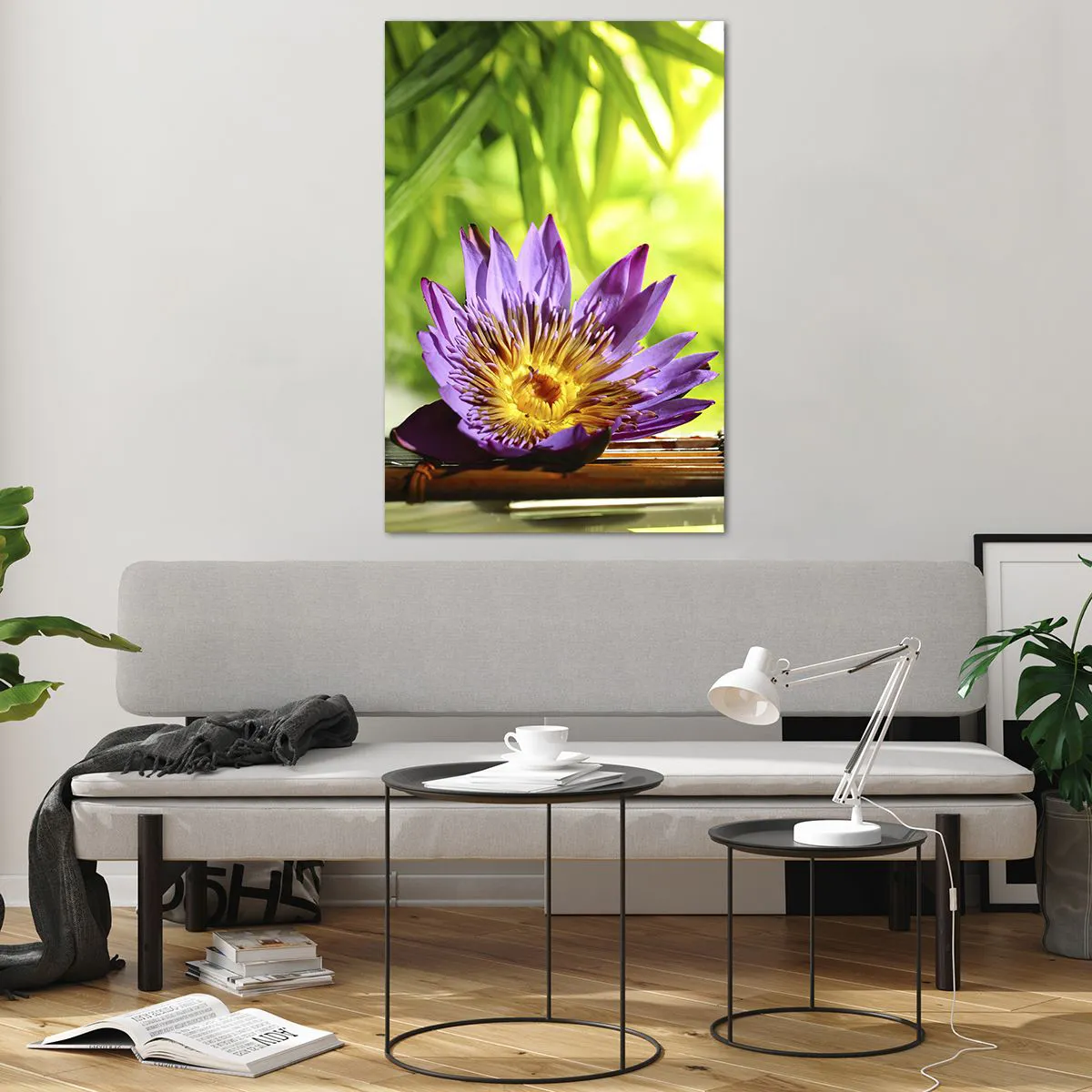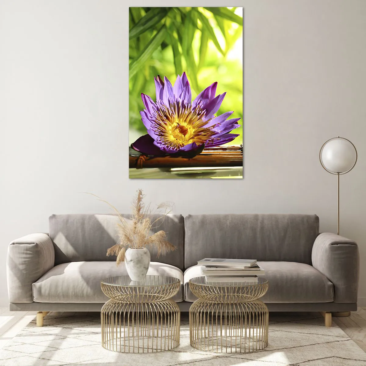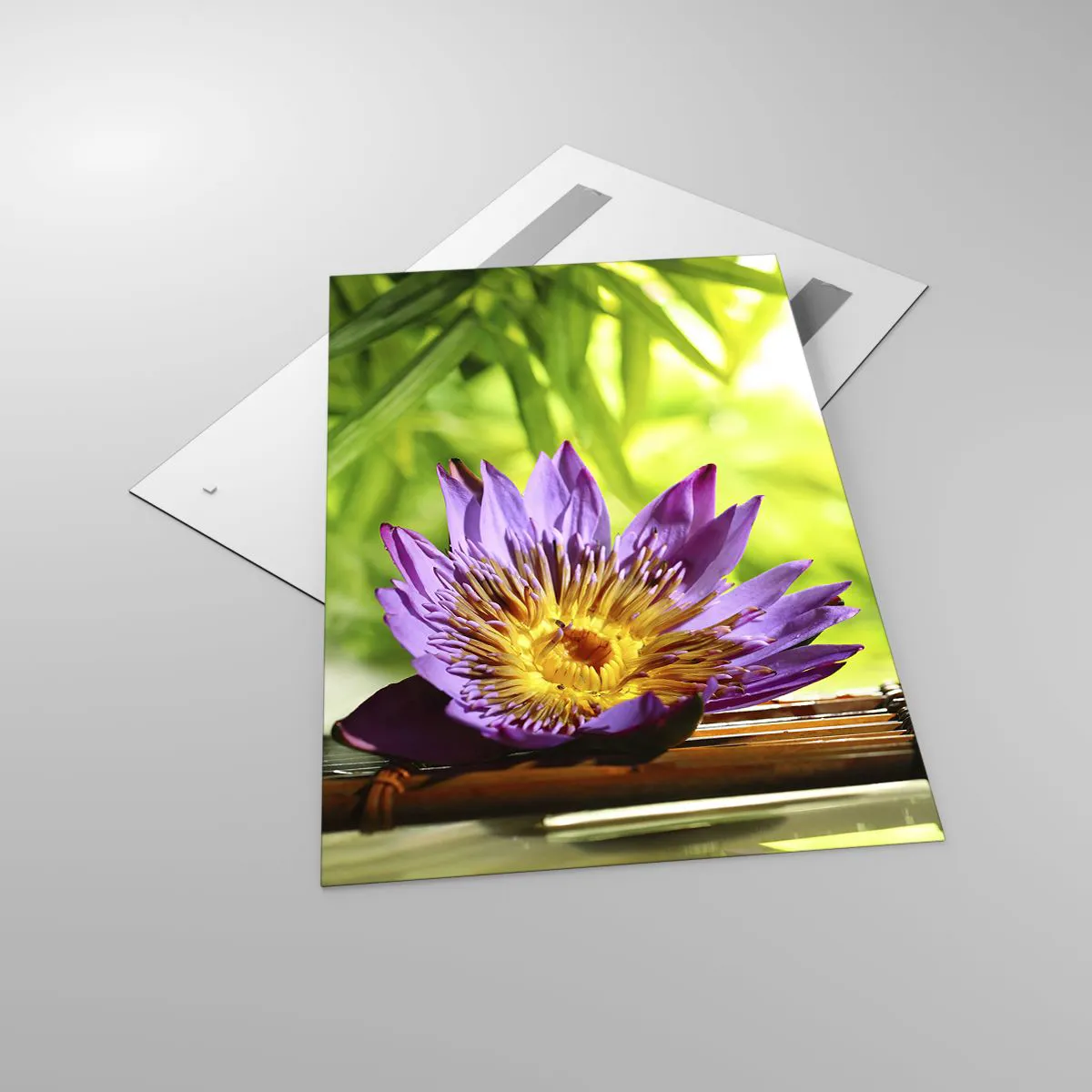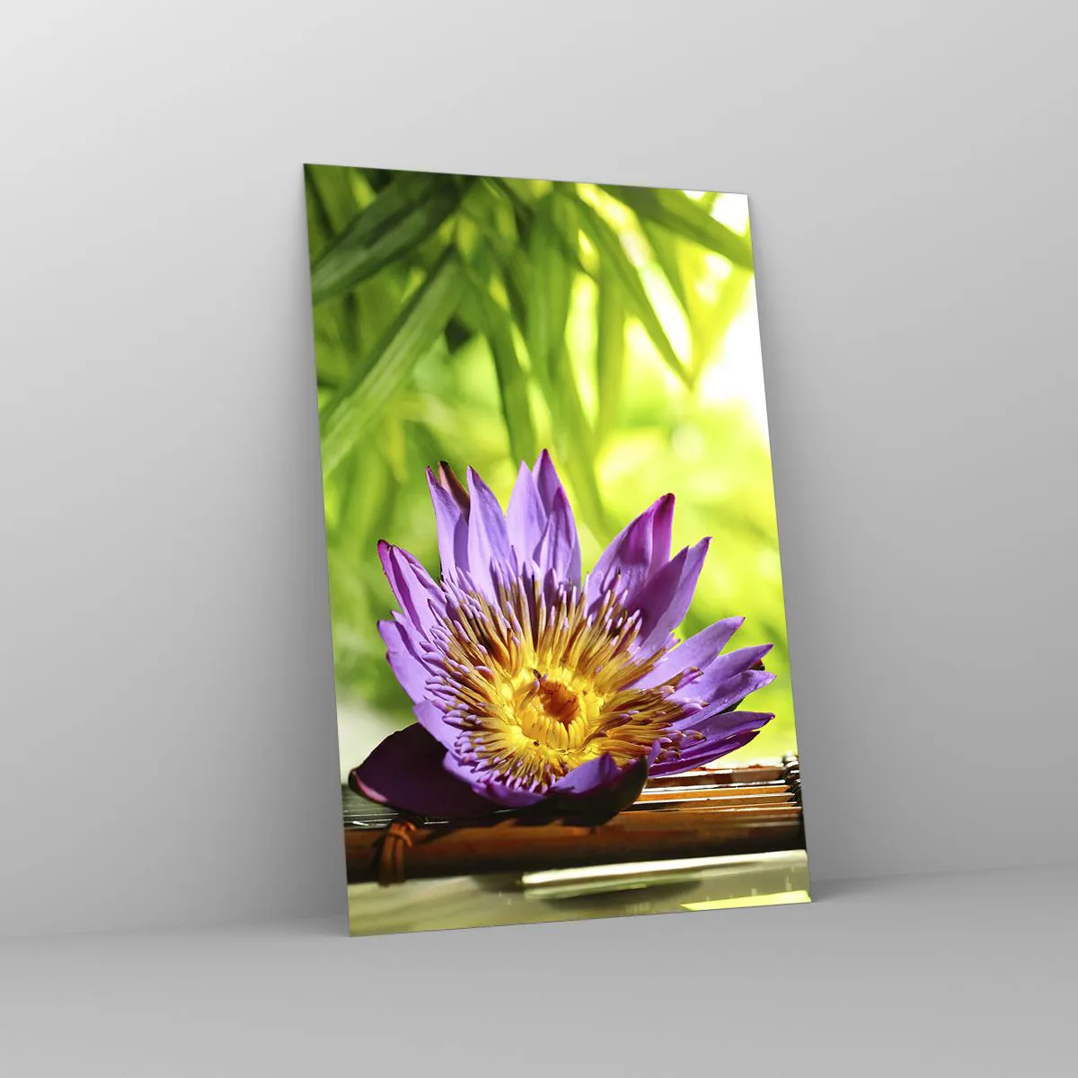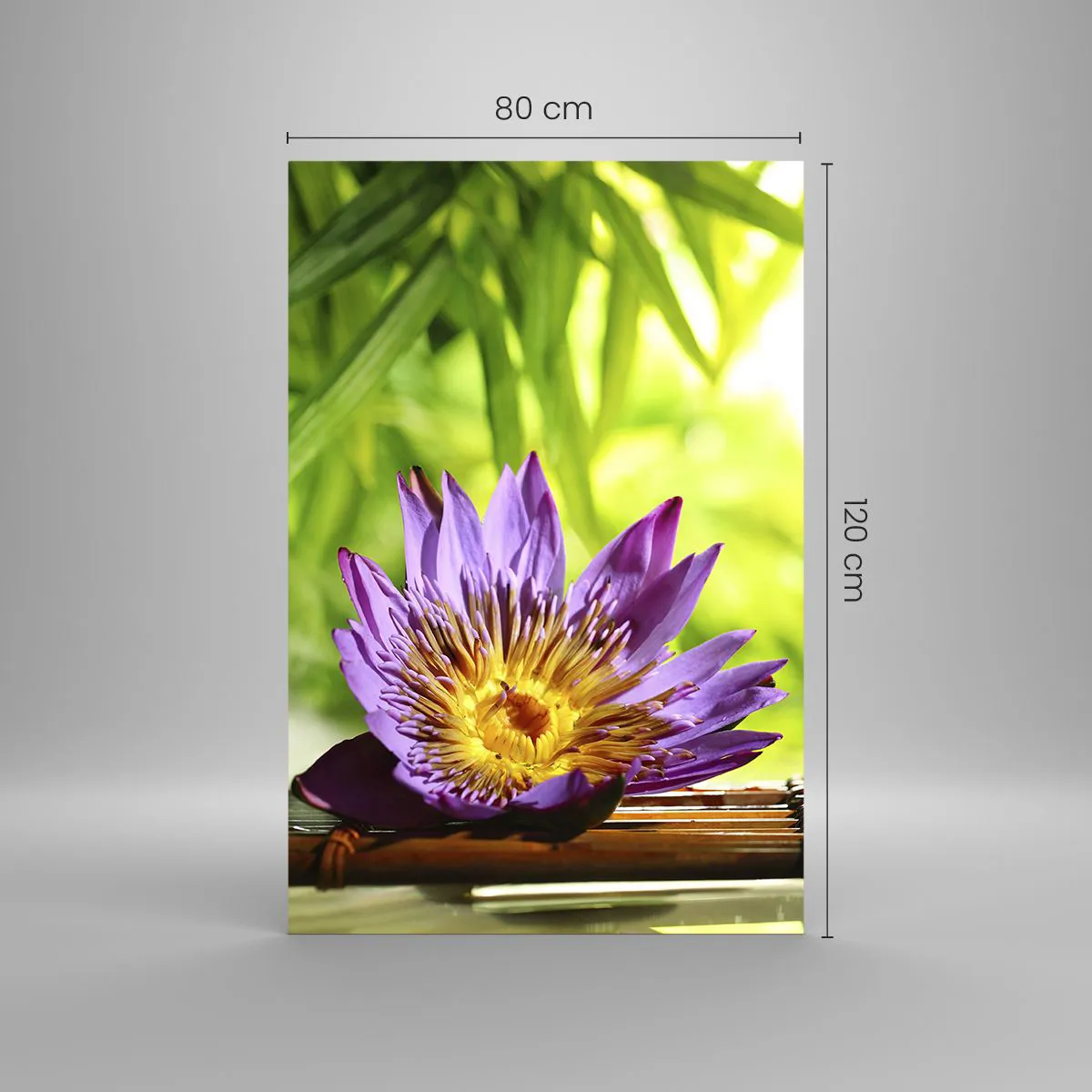 Impression sur verre - Image sur verre - Fleur de lotus violette sur fond de feuilles de bambou vertes - 80x120cm - Sous le soleil asiatique - Décoration murale moderne pour le salon et la chambre ARTTOR