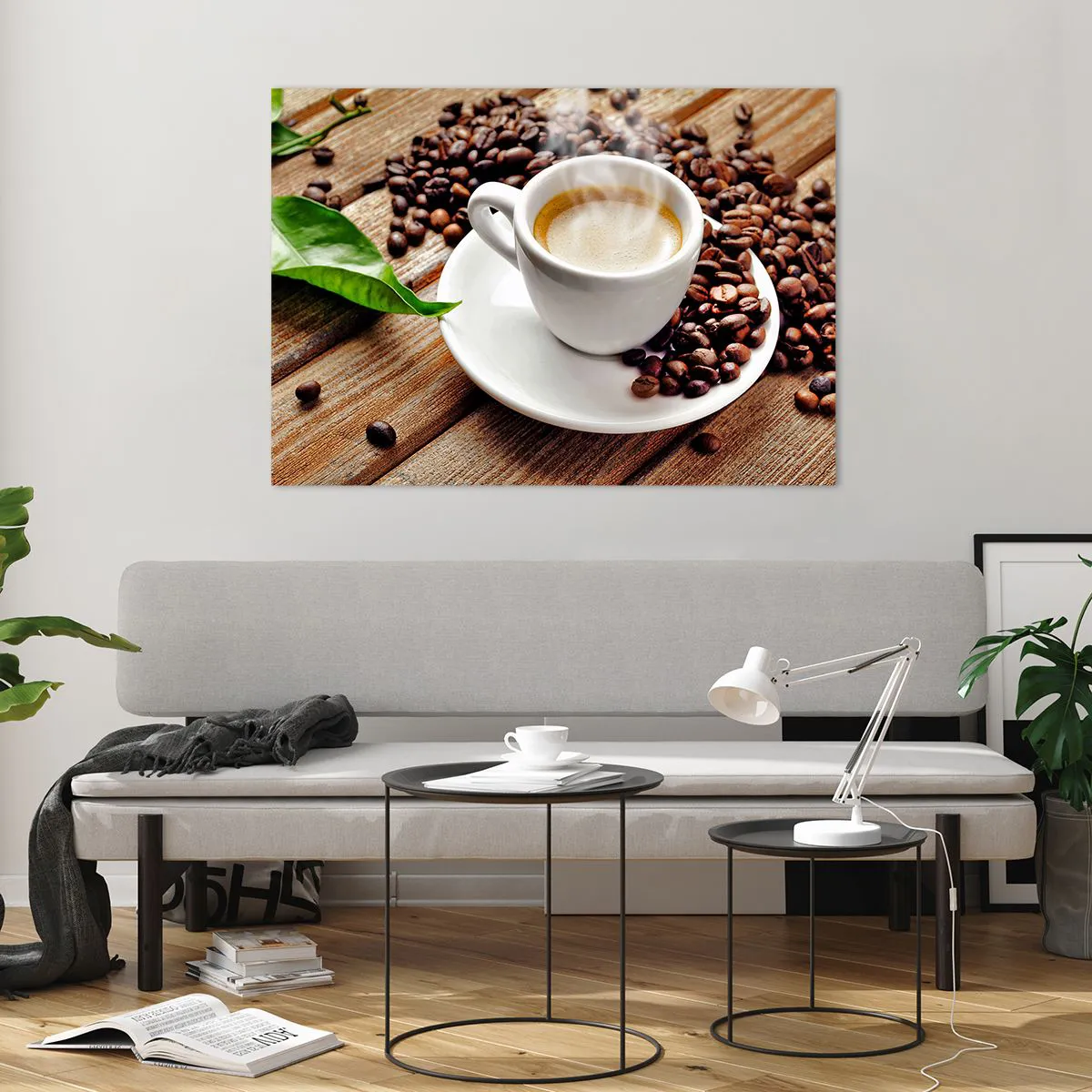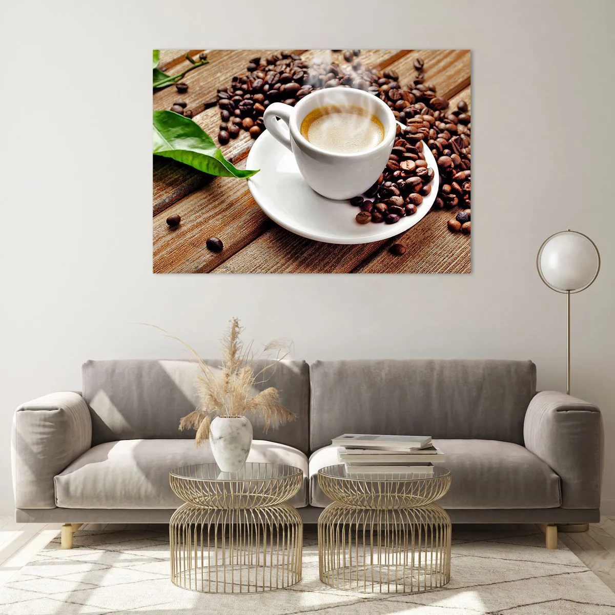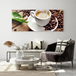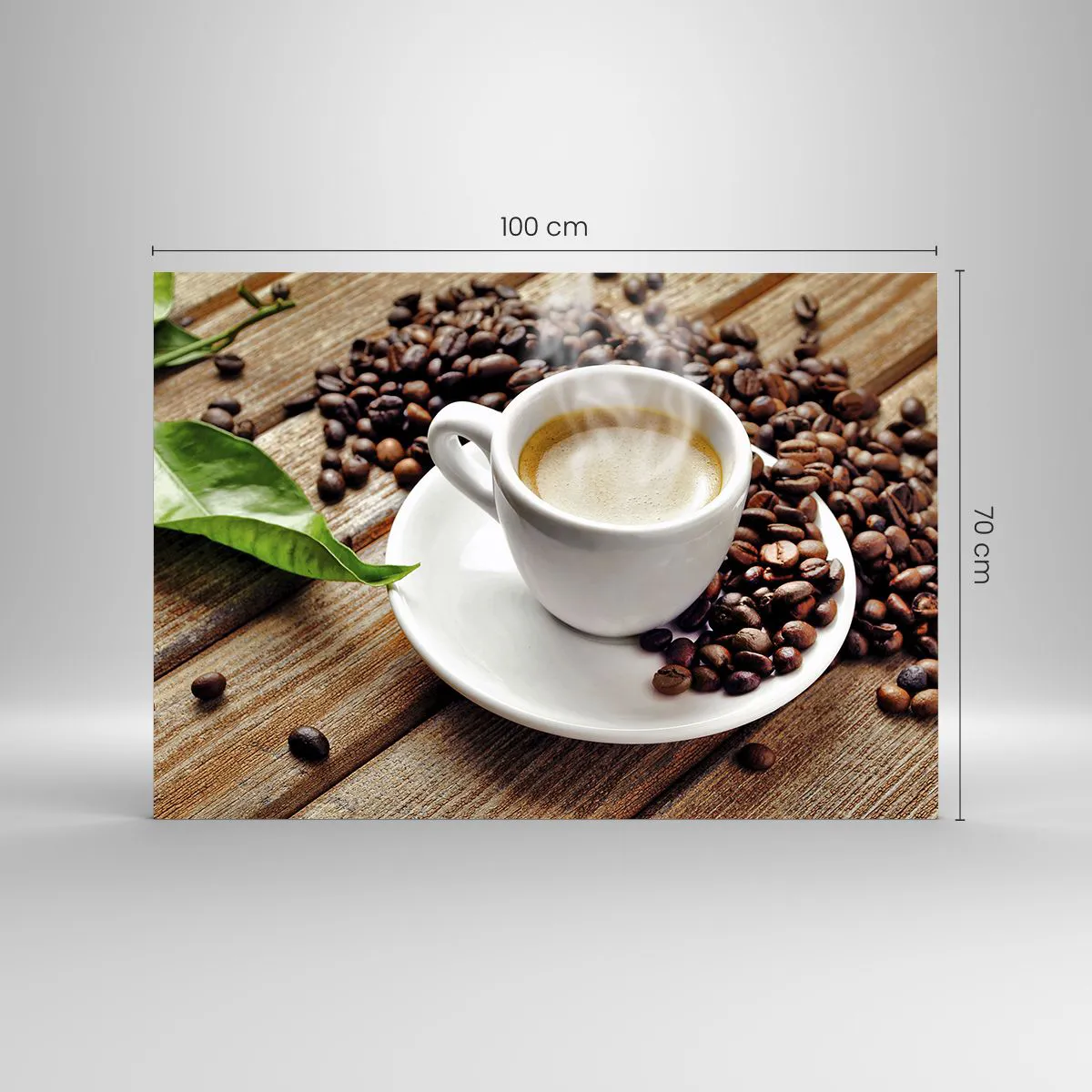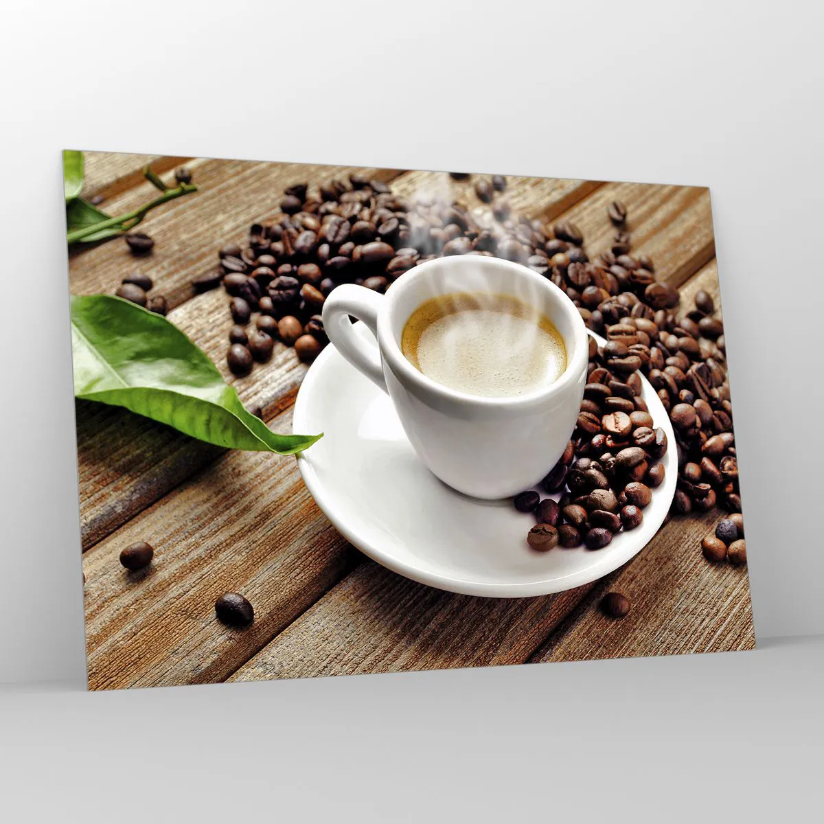 Impression sur verre - Image sur verre - Une tasse de café entourée de grains sur une table en bois - 100x70cm - Café sur un banc - Décoration murale moderne pour le salon et la chambre ARTTOR