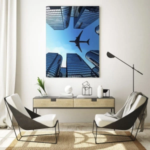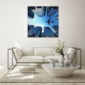 - Cette impression sur verre représente un avion survolant des gratte-ciels modernes. Parfaite pour les intérieurs modernes et minimalistes.