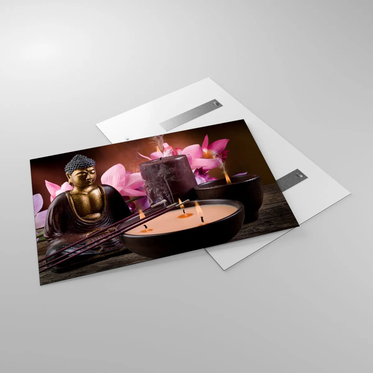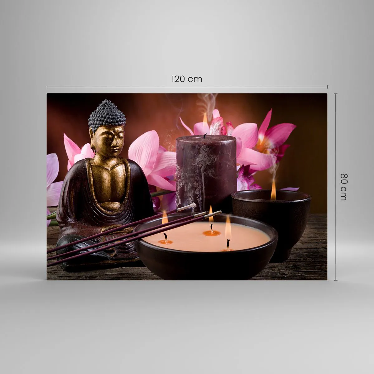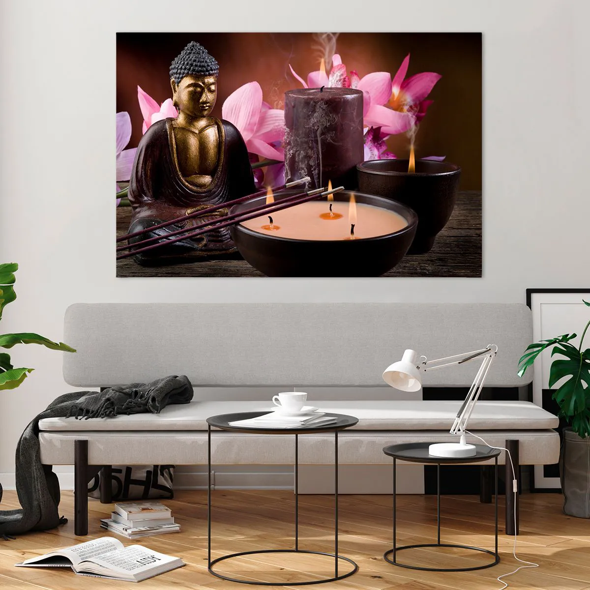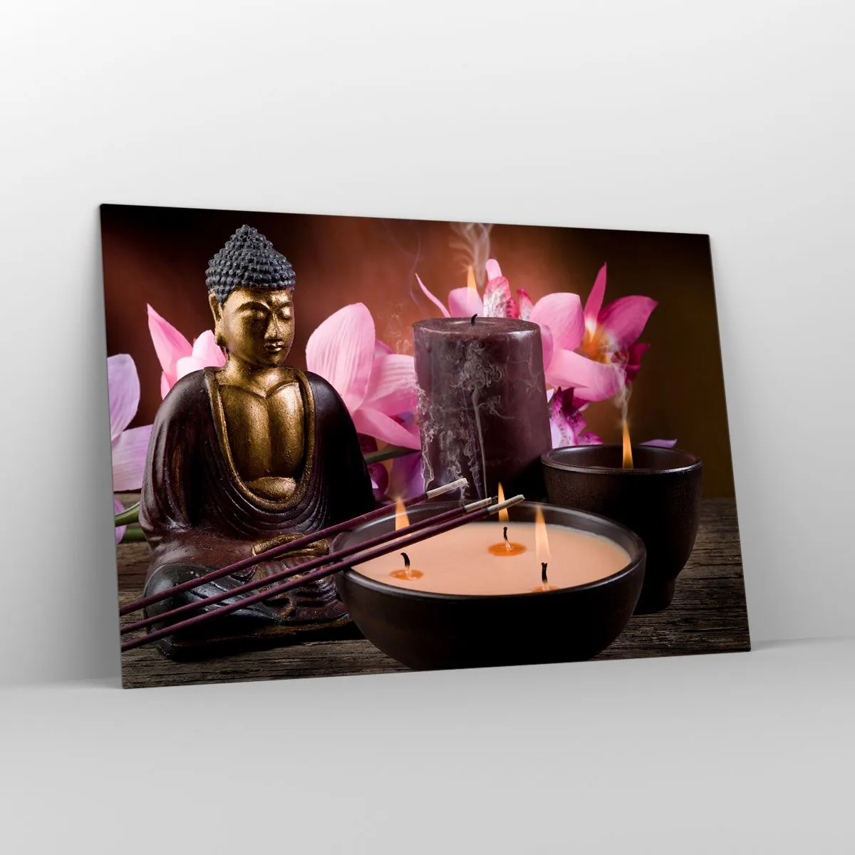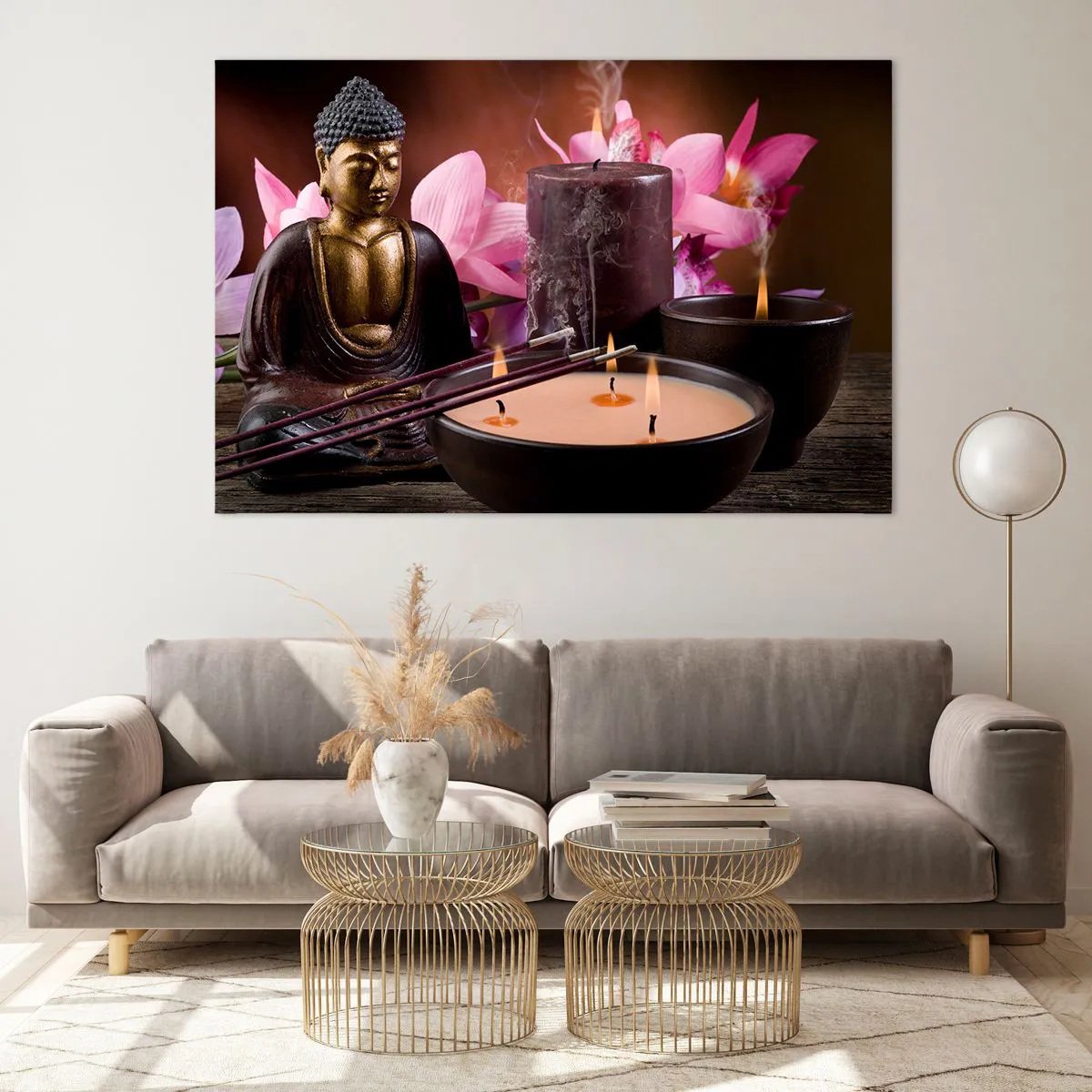 Impression sur verre - Image sur verre - Composition de relaxation avec Bouddha, bougies et fleurs - 120x80cm - Vider l'esprit, calmer le corps - Décoration murale moderne pour le salon et la chambre ARTTOR