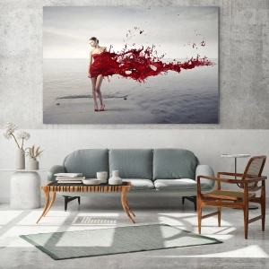 Impression sur verre - Image sur verre - Une femme en robe rouge dans une composition artistique au bord de l'eau - 70x100cm - Passionné comme l'écarlate - Décoration murale moderne pour le salon et la chambre ARTTOR