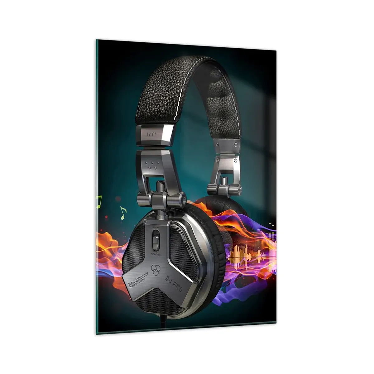 Impression sur verre - Image sur verre - Casque noir avec effet de visualisation musicale colorée - 80x120cm - Dans le feu de la musique - Décoration murale moderne pour le salon et la chambre ARTTOR