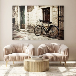 Impression sur verre - Image sur verre - Un vélo noir et blanc appuyé contre un vieil immeuble - 120x80cm - Retour au passé - Décoration murale moderne pour le salon et la chambre ARTTOR