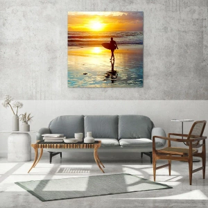 Impression sur verre - Image sur verre - Un surfeur marchant sur la plage au coucher du soleil avec une planche à la main. - 140x50cm - Le retour du guerrier - Décoration murale moderne pour le salon et la chambre ARTTOR