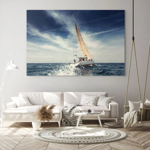 Un tableau représentant un yacht naviguant sur une mer agitée sous un ciel bleu. Une décoration parfaite pour les amateurs de voile et d'aventures nautiques.