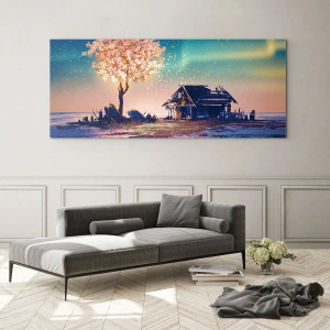 Impression sur verre - Image sur verre - Un paysage magique avec un arbre en fleurs et un chalet - 50x70cm - La nature ne passe pas - Décoration murale moderne pour le salon et la chambre ARTTOR