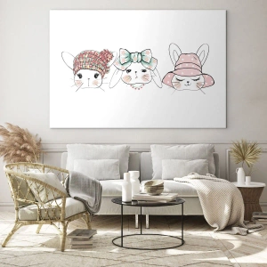 Impression sur verre - Image sur verre - Adorables lapins portant des coiffes pastel - 140x50cm - Pensif, triste, satisfait - Décoration murale moderne pour le salon et la chambre ARTTOR