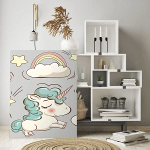 Impression sur verre - Image sur verre - De jolies licornes dans les nuages avec un arc-en-ciel et des ballons - 100x70cm - Ils existe, c'est sûr… - Décoration murale moderne pour le salon et la chambre ARTTOR