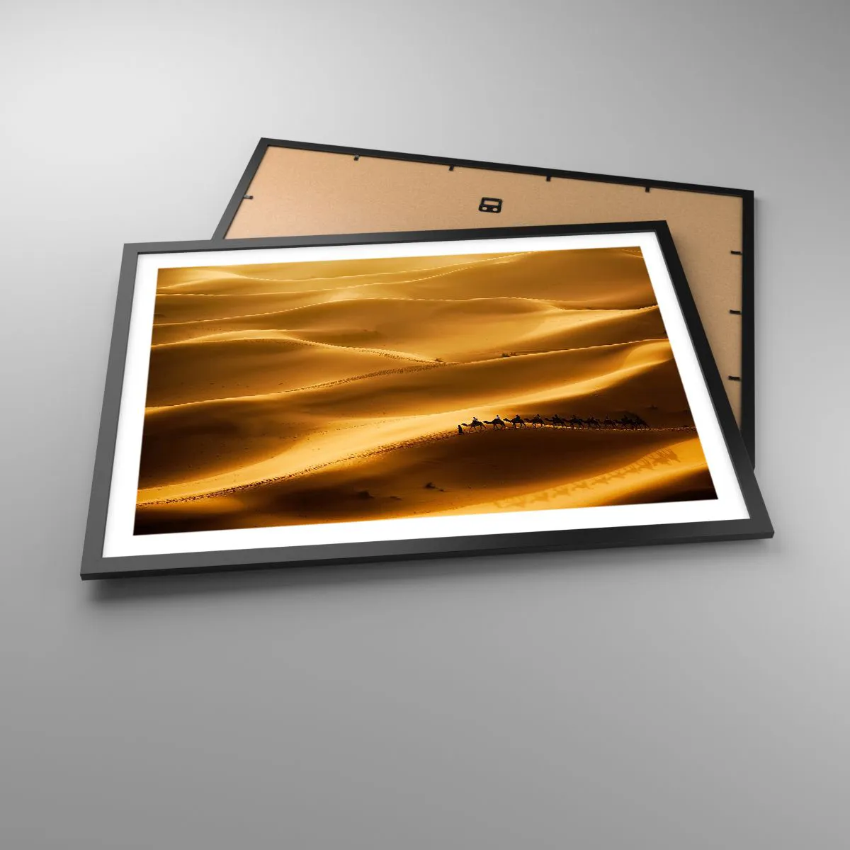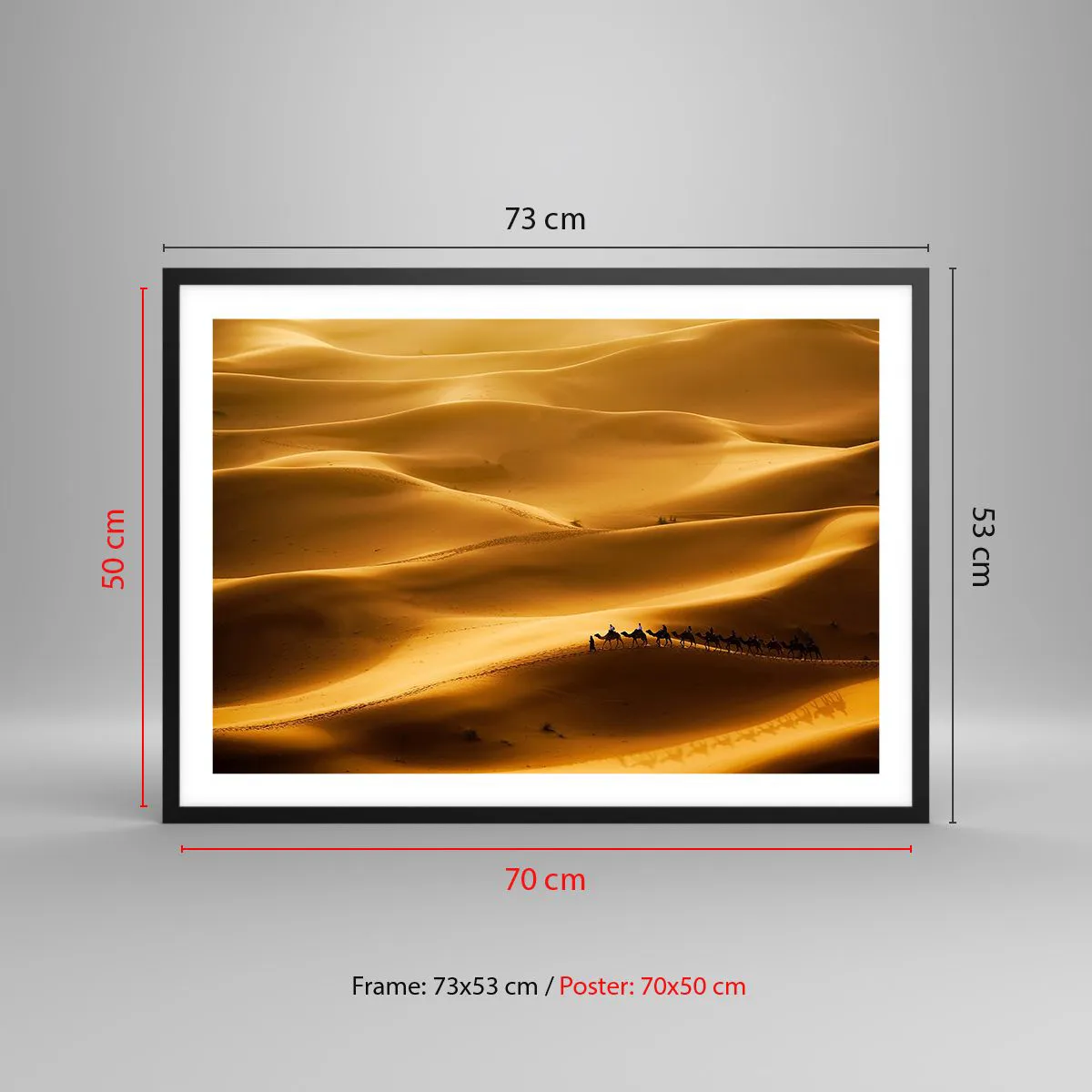 Affiche dans un cadre noir - Poster - Une caravane de chameaux errant à travers les dunes dorées du désert. - 70x50cm - Caravane sur les vagues du désert - Décoration murale moderne pour le salon et la chambre ARTTOR