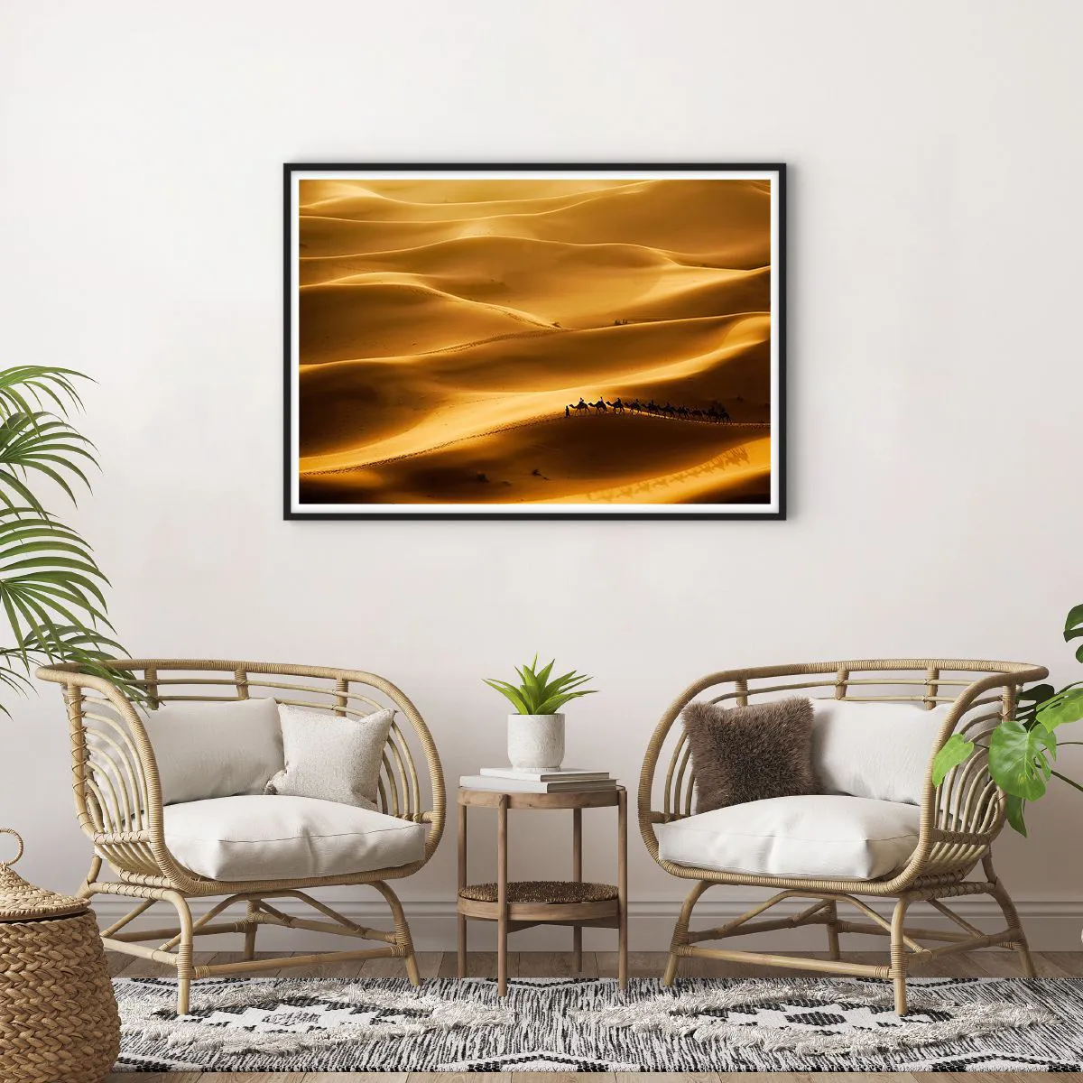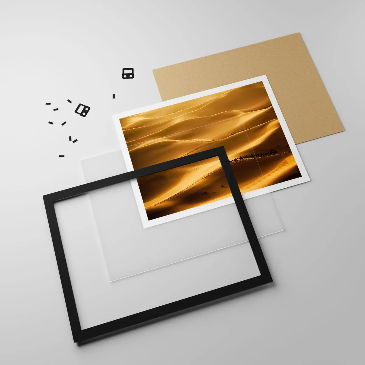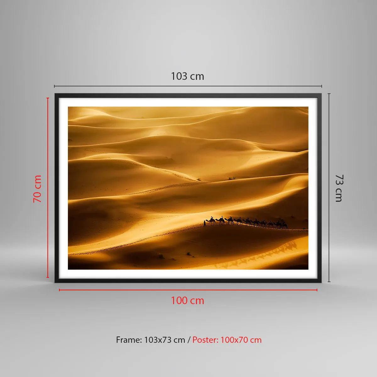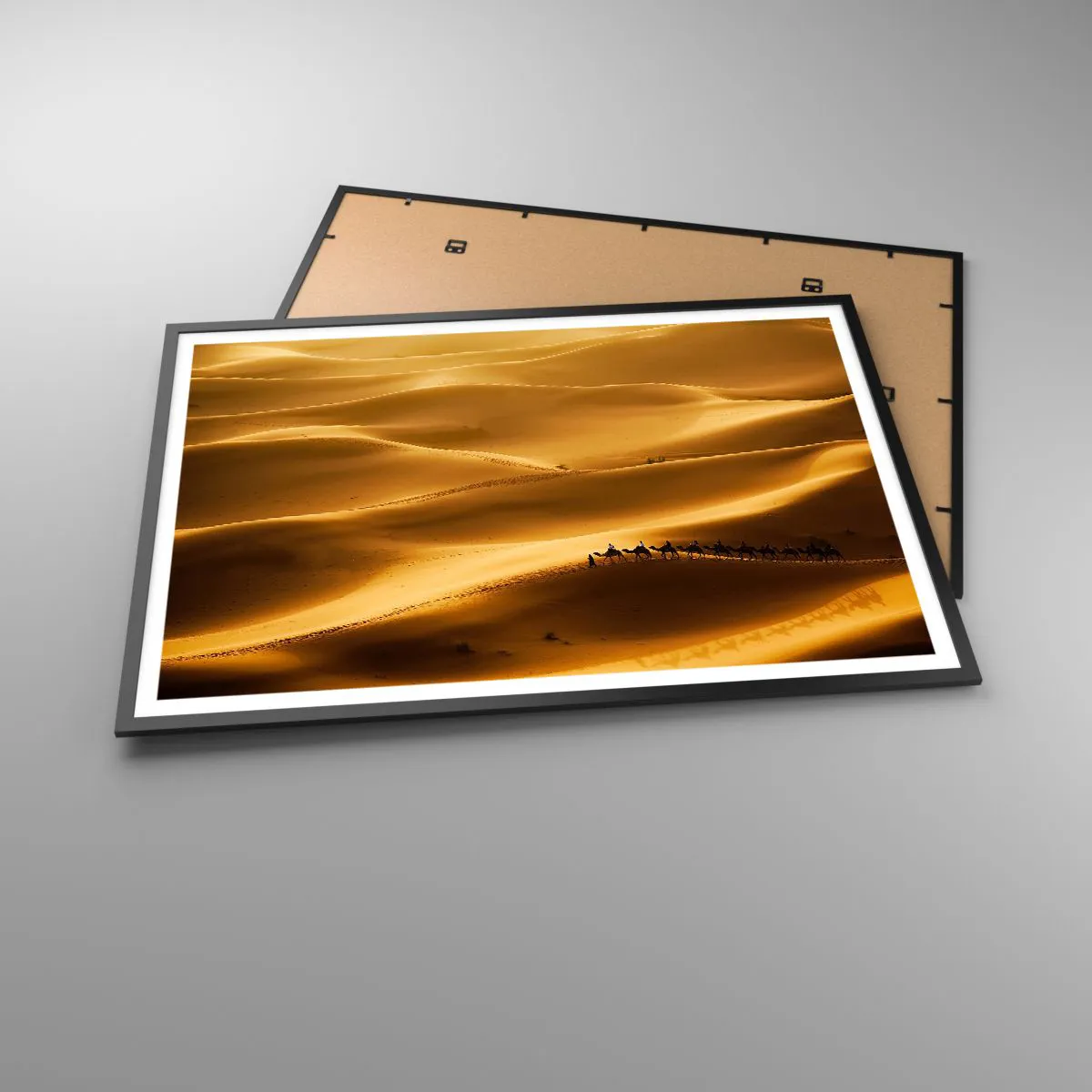 Affiche dans un cadre noir - Poster - Une caravane de chameaux errant à travers les dunes dorées du désert. - 100x70cm - Caravane sur les vagues du désert - Décoration murale moderne pour le salon et la chambre ARTTOR