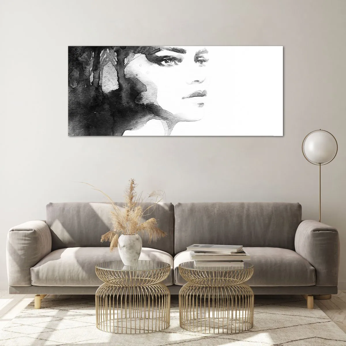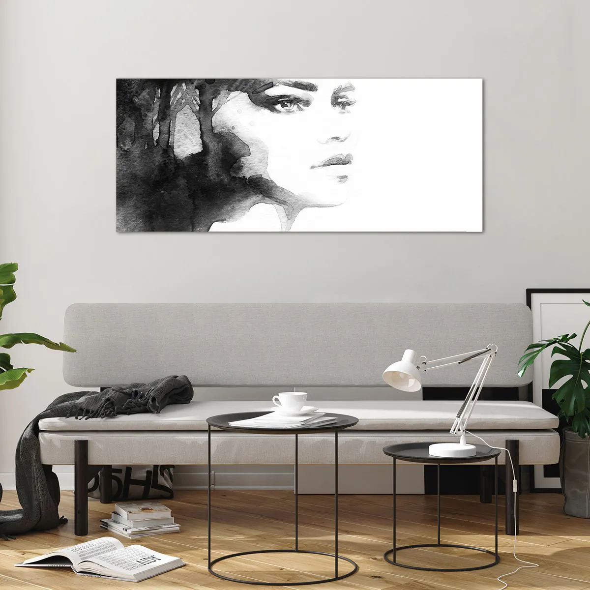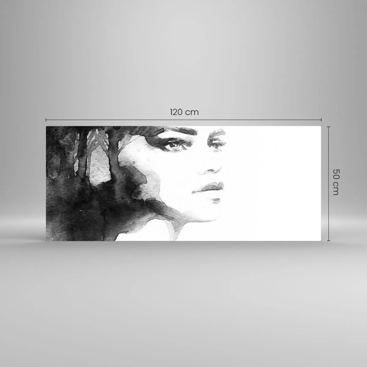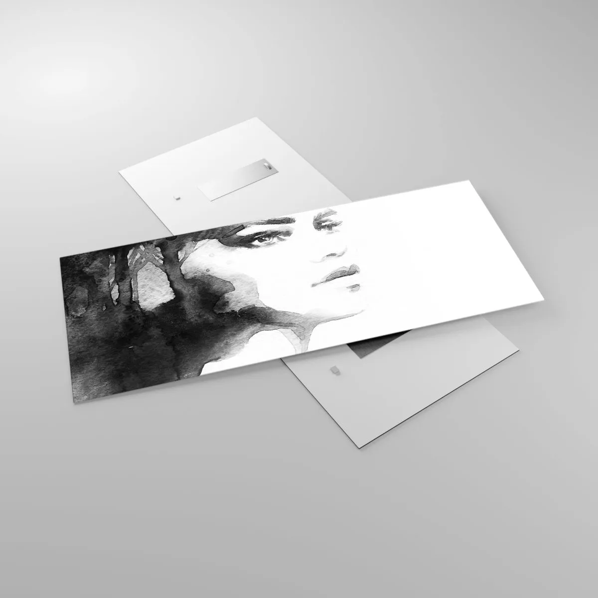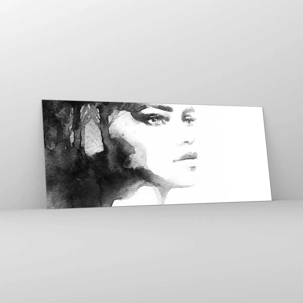Impression sur verre - Image sur verre - Un portrait subtil d'une femme dans des tons de noir et blanc - 120x50cm - Fait de mystère et de brouillard - Décoration murale moderne pour le salon et la chambre ARTTOR