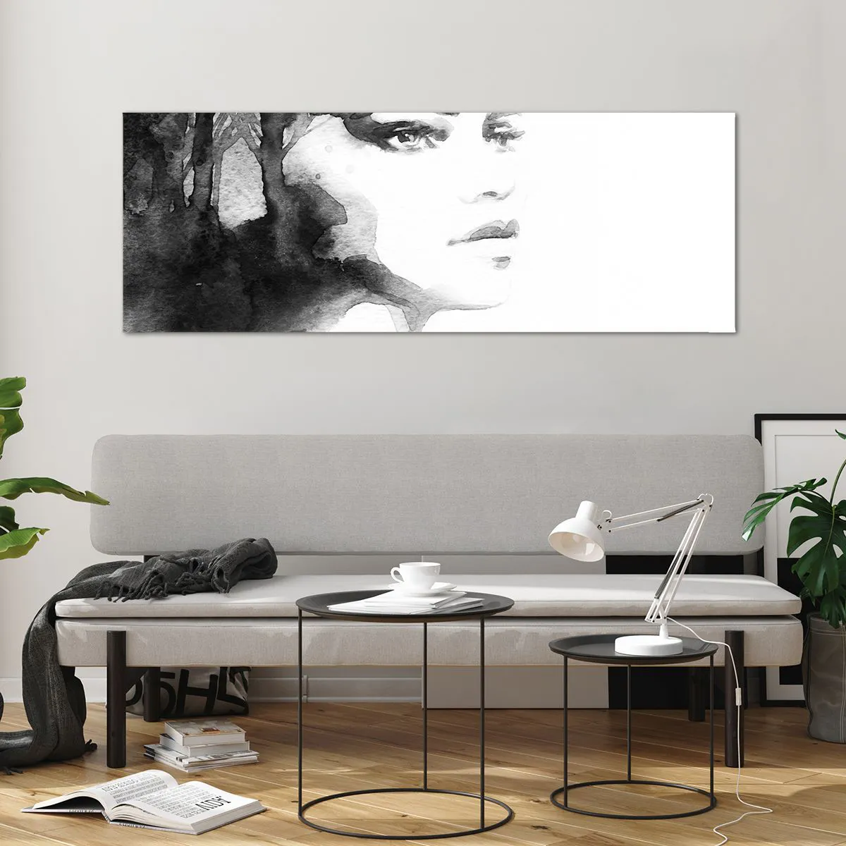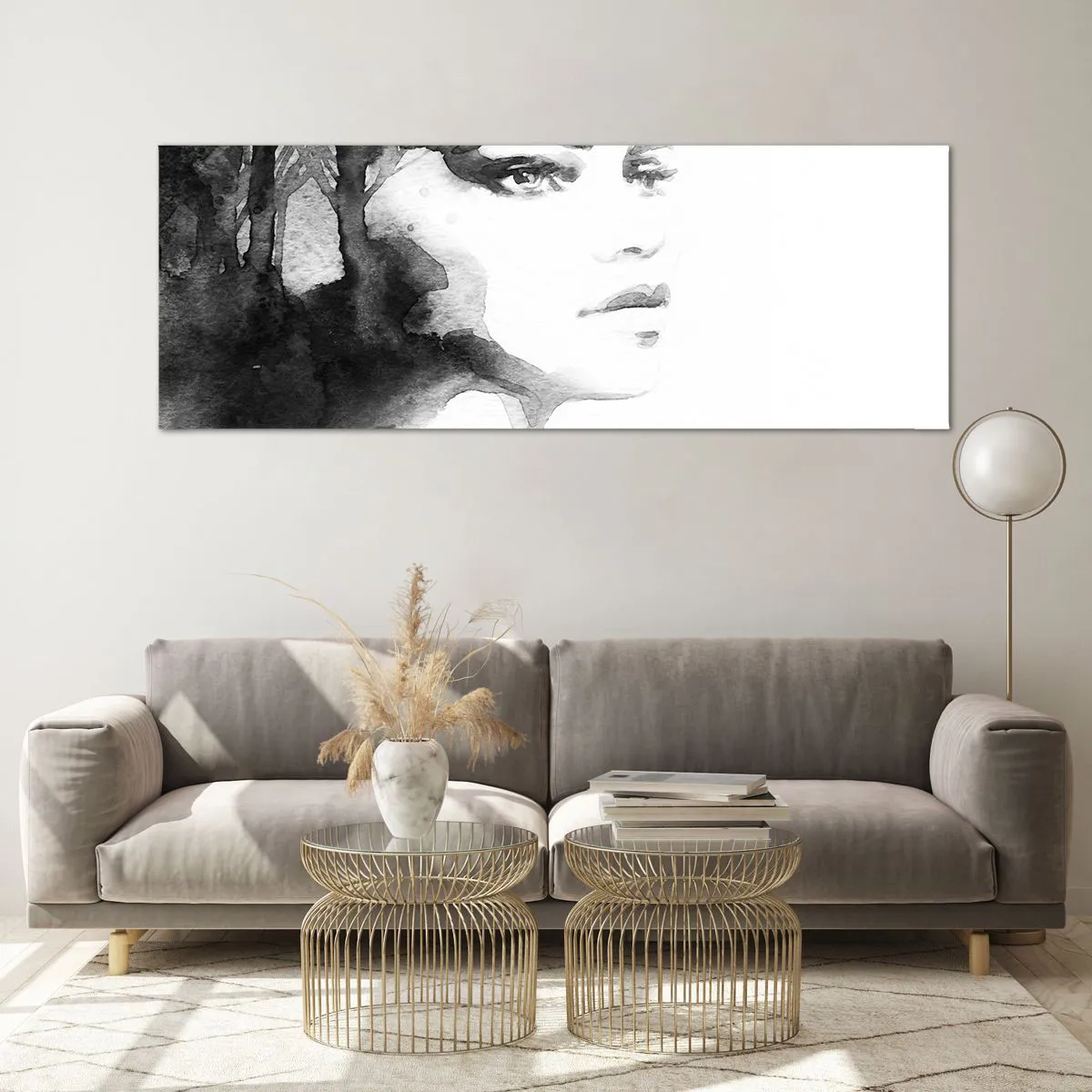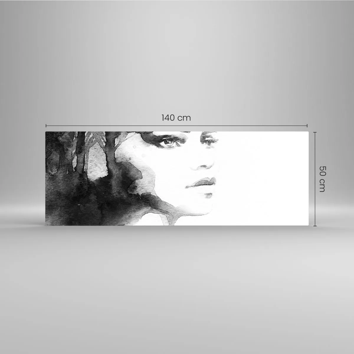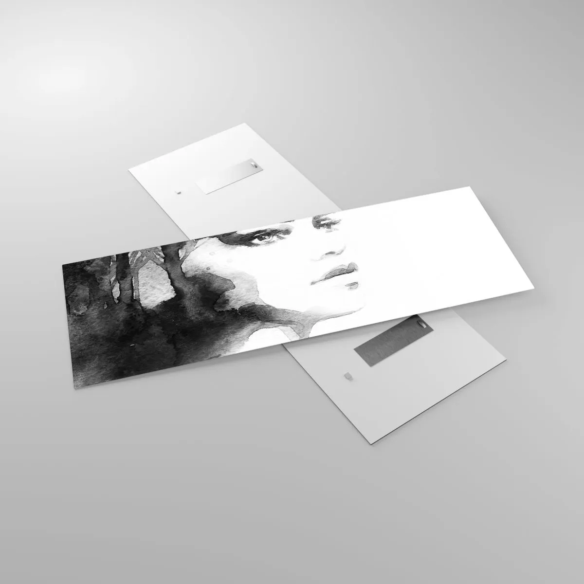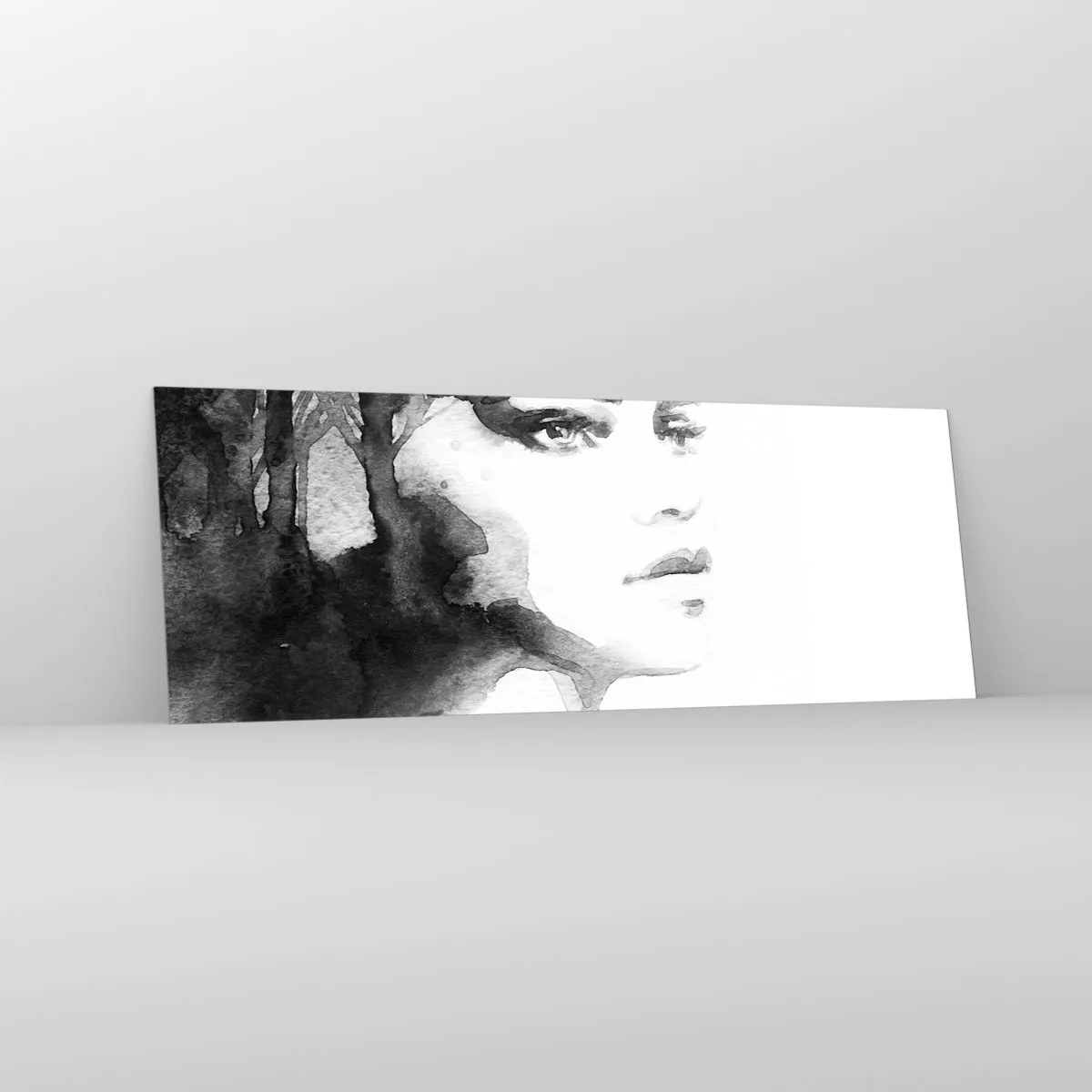Impression sur verre - Image sur verre - Un portrait subtil d'une femme dans des tons de noir et blanc - 140x50cm - Fait de mystère et de brouillard - Décoration murale moderne pour le salon et la chambre ARTTOR
