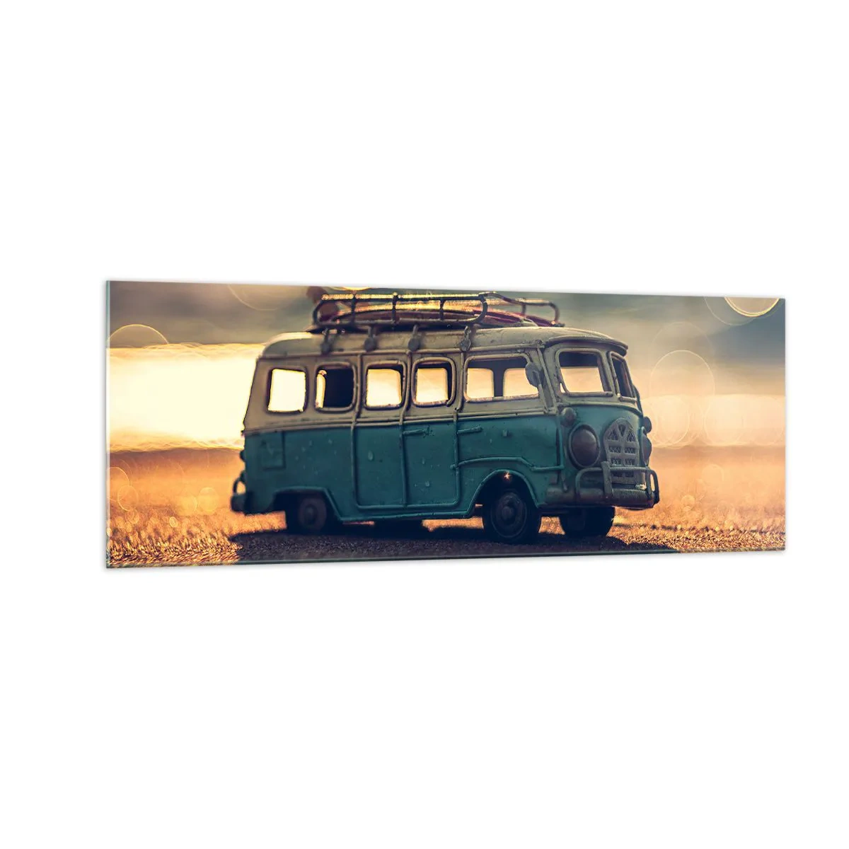 Impression sur verre - Image sur verre - Bus rétro contre une lumière floue - 140x50cm - La fin des idoles : argent et travail - Décoration murale moderne pour le salon et la chambre ARTTOR