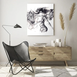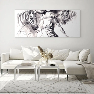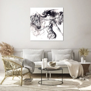 Impression sur verre - Image sur verre - Composition en noir et blanc avec une femme et un zèbre dans un style artistique - 50x70cm - Danse avec les zèbres - Décoration murale moderne pour le salon et la chambre ARTTOR