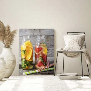 Impression sur verre - Image sur verre - Bouteilles d'eau fruitée et d'herbes sur fond de bois - 70x100cm - Sain par nature - Décoration murale moderne pour le salon et la chambre ARTTOR