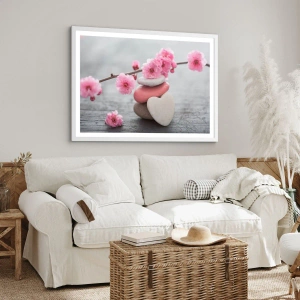 Affiche dans un cadre blanc - Poster - Le bonheur avec une fleur de cerisier - 91x61 cm