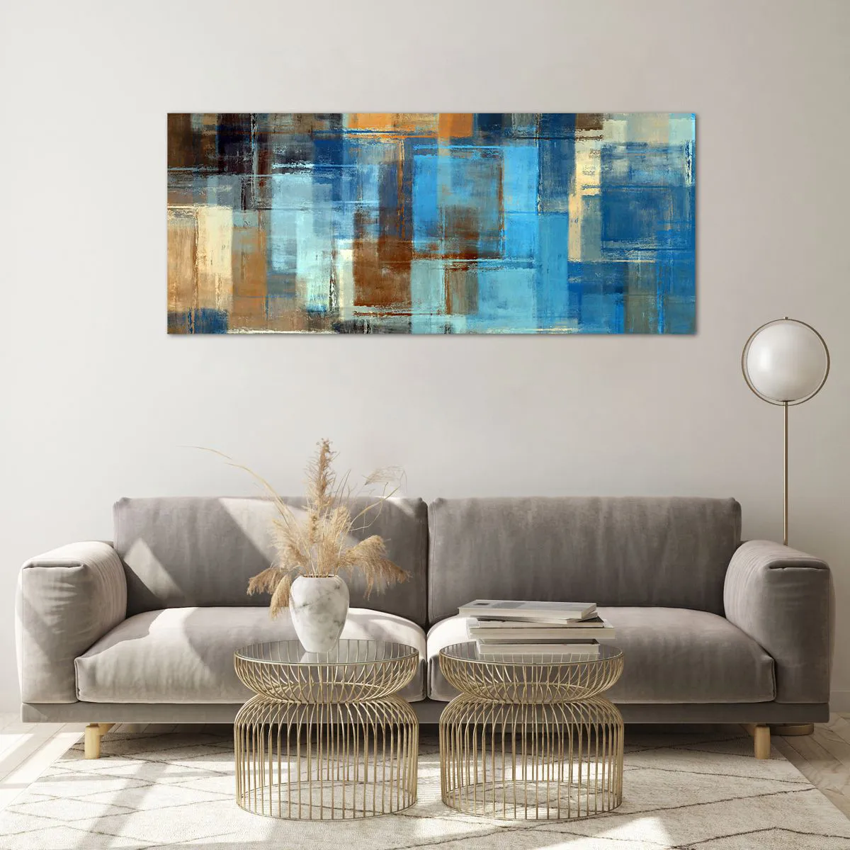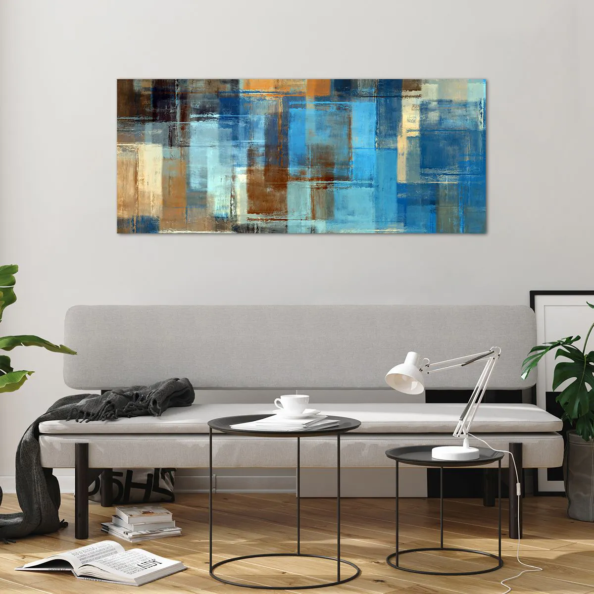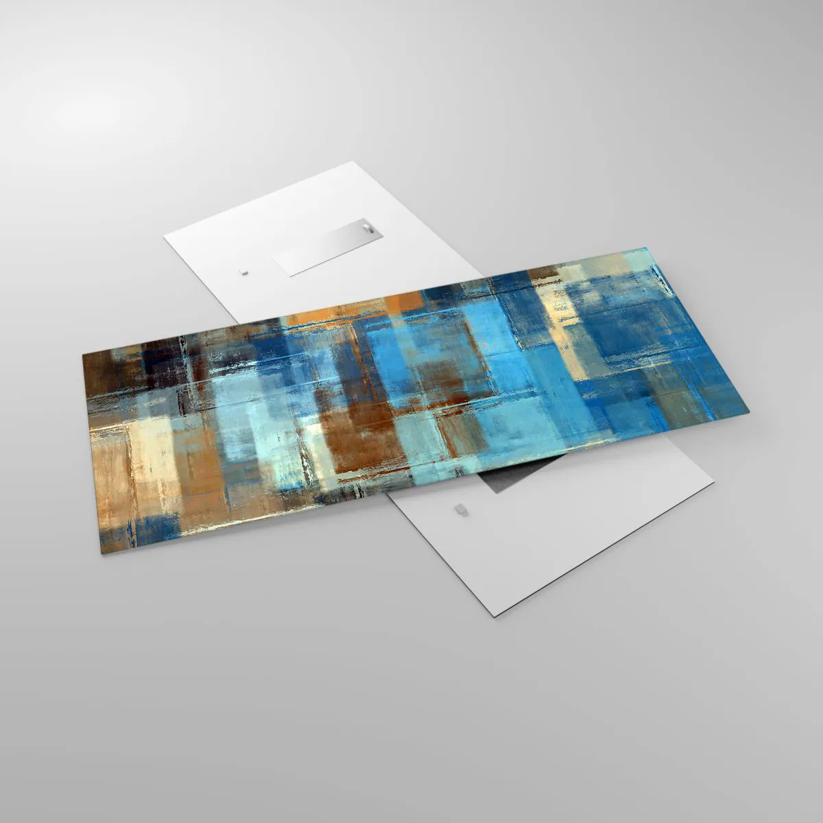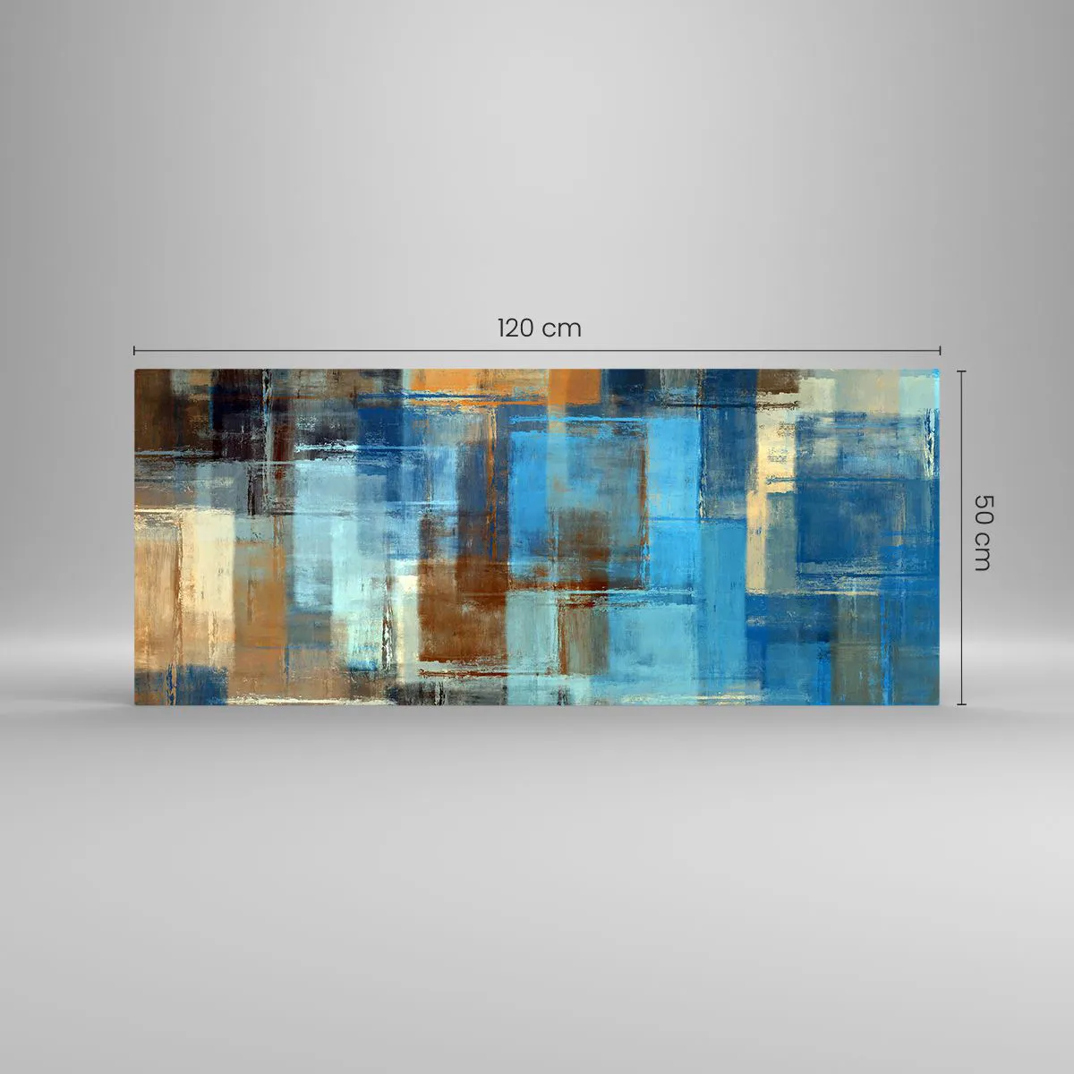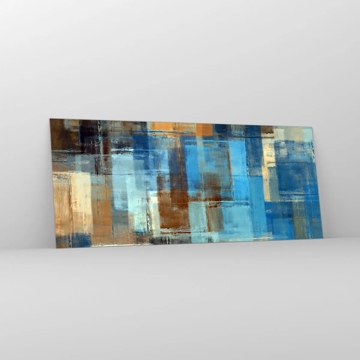 Impression sur verre - Image sur verre - Composition géométrique abstraite dans les tons de bleu et de marron - 120x50cm - A travers le voile bleu - Décoration murale moderne pour le salon et la chambre ARTTOR