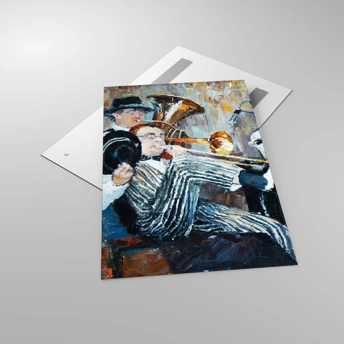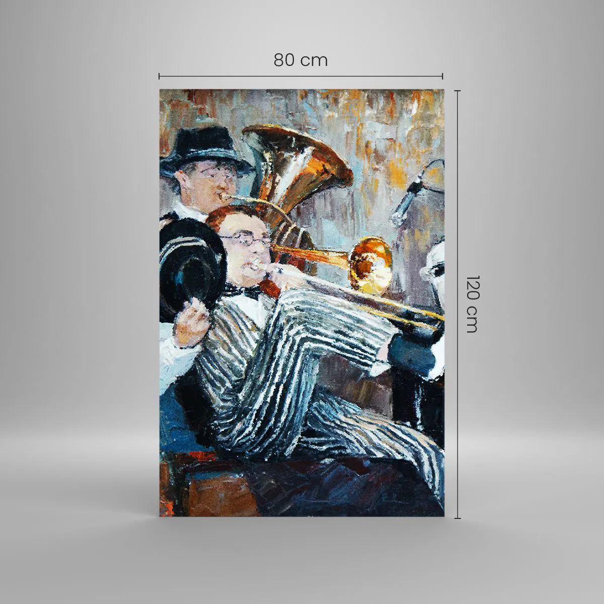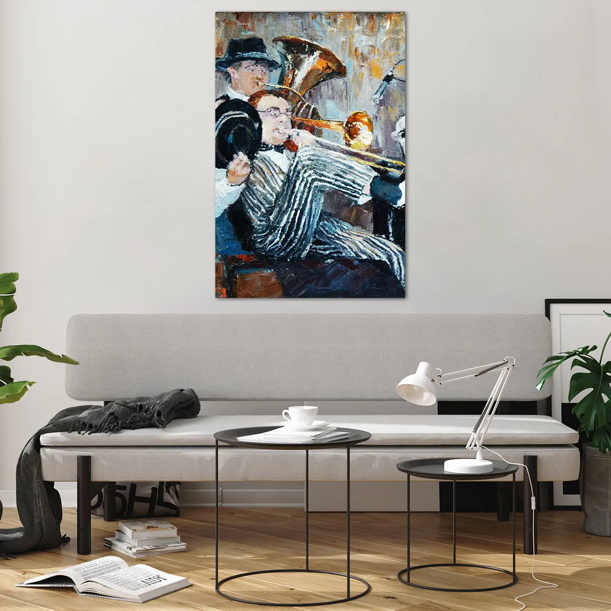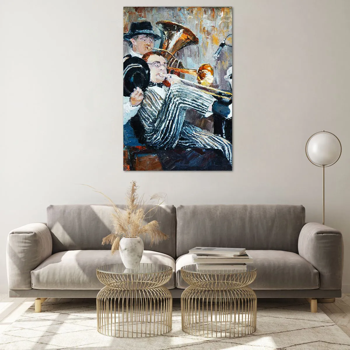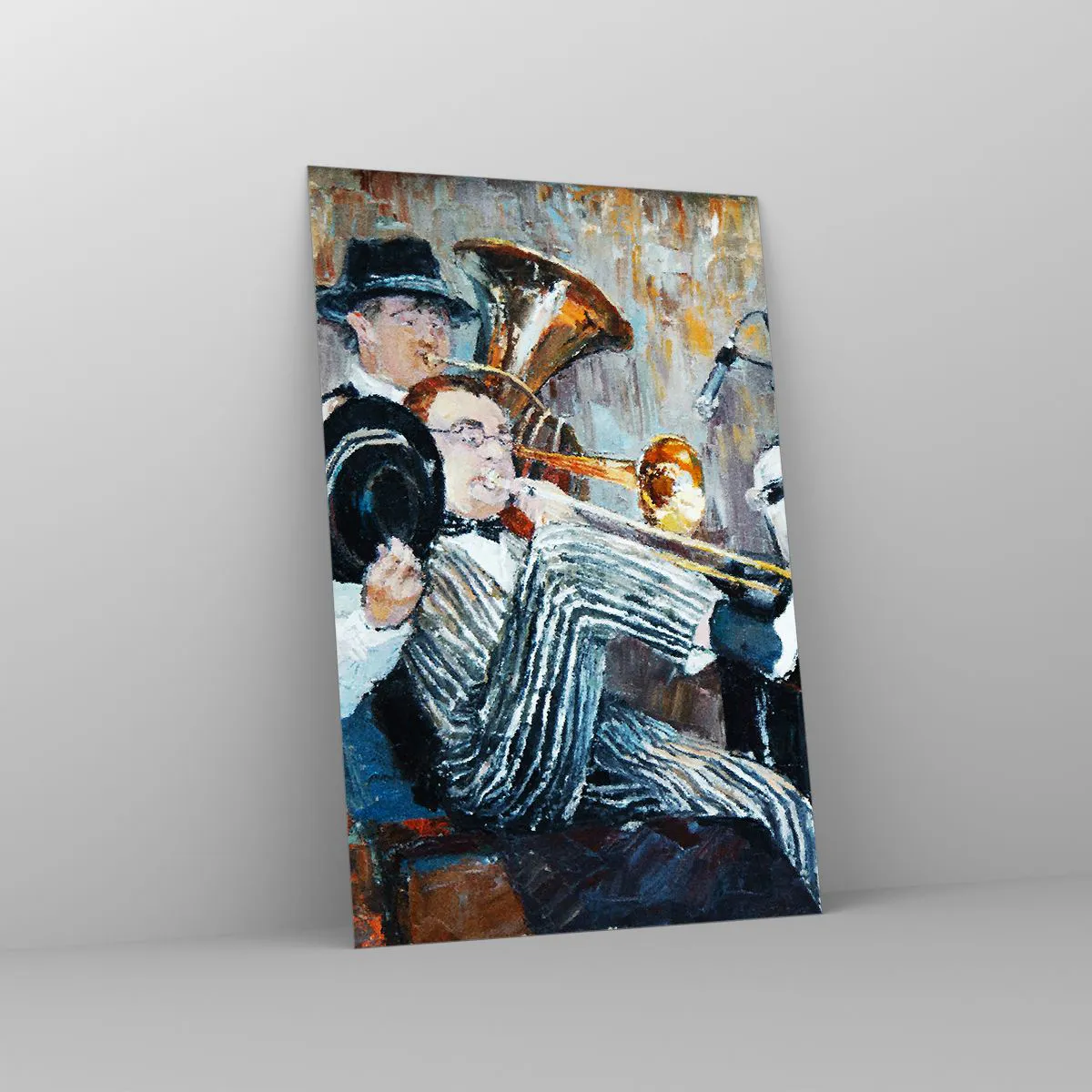 Impression sur verre - Image sur verre - Des musiciens de jazz dans un style pictural lors d'un concert - 80x120cm - C'est tout le Jazz - Décoration murale moderne pour le salon et la chambre ARTTOR