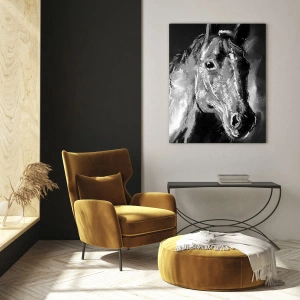 - Ce tableau représente le portrait d'un cheval dans des tons noir et blanc sur un fond sombre. Il est idéal comme décoration moderne pour les intérieurs élégants.