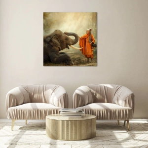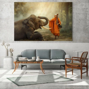 Impression sur verre - Image sur verre - Un moine en robe orange avec un éléphant dans un décor naturel - 120x80cm - Rencontre en voyageant - Décoration murale moderne pour le salon et la chambre ARTTOR