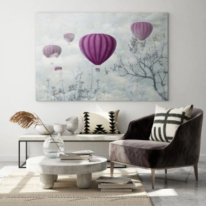 Impression sur verre - Image sur verre - Des ballons violets flottant au-dessus des arbres dans les nuages - 70x100cm - Comme des navires dans le ciel - Décoration murale moderne pour le salon et la chambre ARTTOR