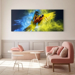 Impression sur verre - Image sur verre - Un perroquet coloré en vol sur un fond jaune et bleu - 70x50cm - Dans la poussière bleue et dorée - Décoration murale moderne pour le salon et la chambre ARTTOR
