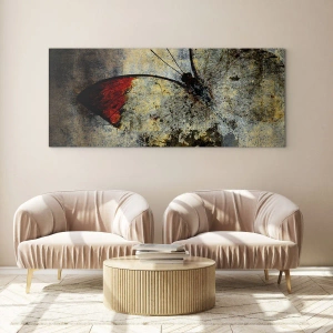 Impression sur verre - Image sur verre - Un papillon dans les tons de rouge et de gris sur un fond texturé - 140x50cm - Regarde avant que je disparaisse - Décoration murale moderne pour le salon et la chambre ARTTOR