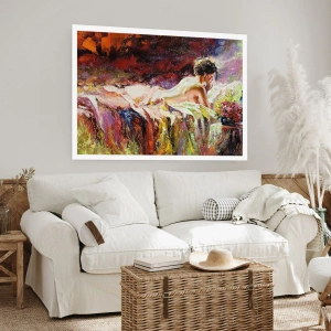 Affiche - Poster - Une femme allongée sur un lit sur un fond de couleurs abstraites. - 100x70cm - Vénus en pensée - Décoration murale moderne pour le salon et la chambre ARTTOR