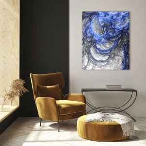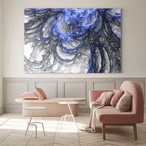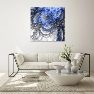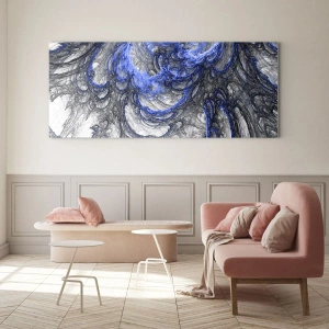 - Cette impression sur verre de 70 x 50 cm présente une abstraction dynamique dans des tons bleus et gris. Parfaite pour les intérieurs modernes au caractère unique.