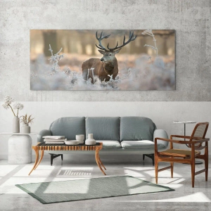 Impression sur verre - Image sur verre - Un cerf dans une clairière gelée entourée d'une forêt hivernale - 120x80cm - Une matinée animée - Décoration murale moderne pour le salon et la chambre ARTTOR