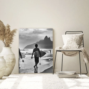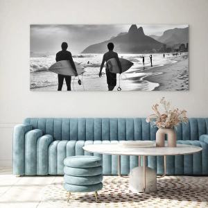 Impression sur verre - Image sur verre - Deux surfeurs marchant sur la plage avec leurs planches en noir et blanc. - 160x50cm - Samba sur une vague - Décoration murale moderne pour le salon et la chambre ARTTOR