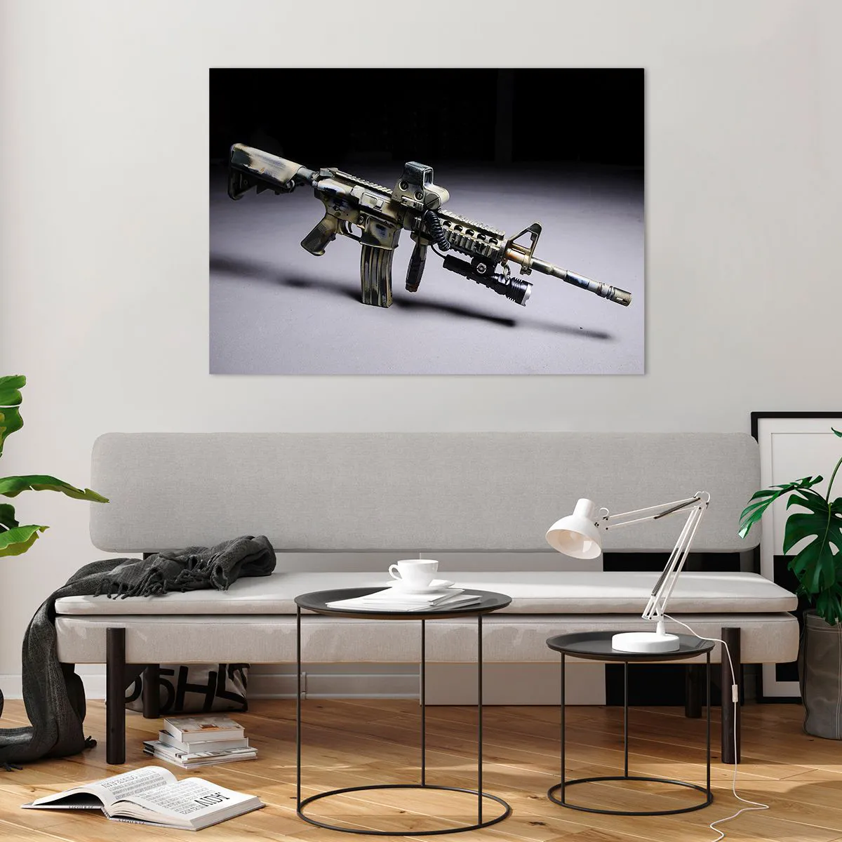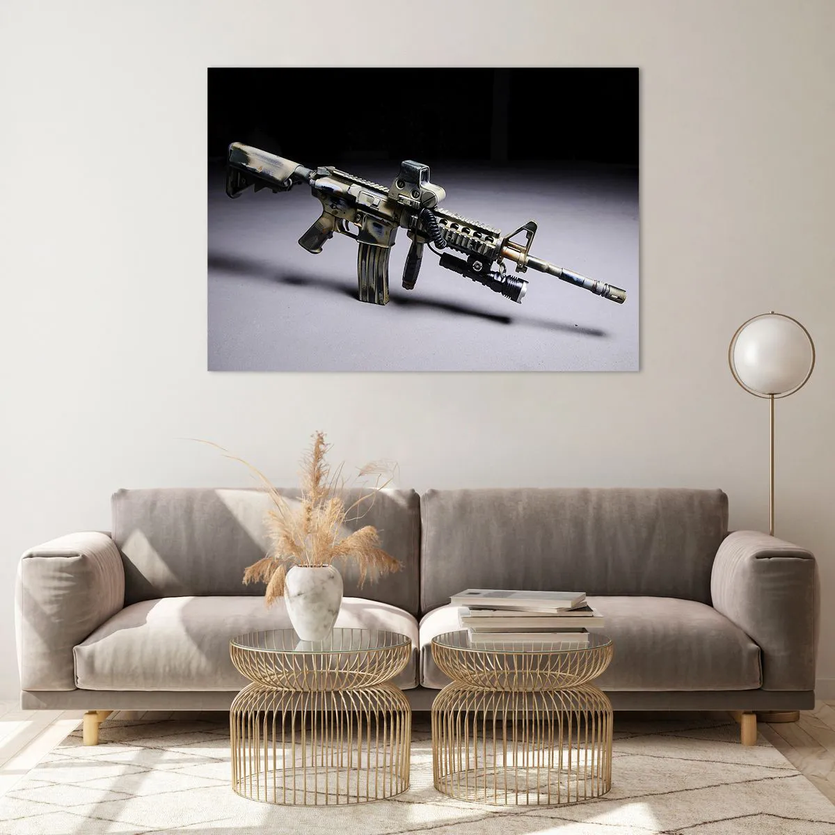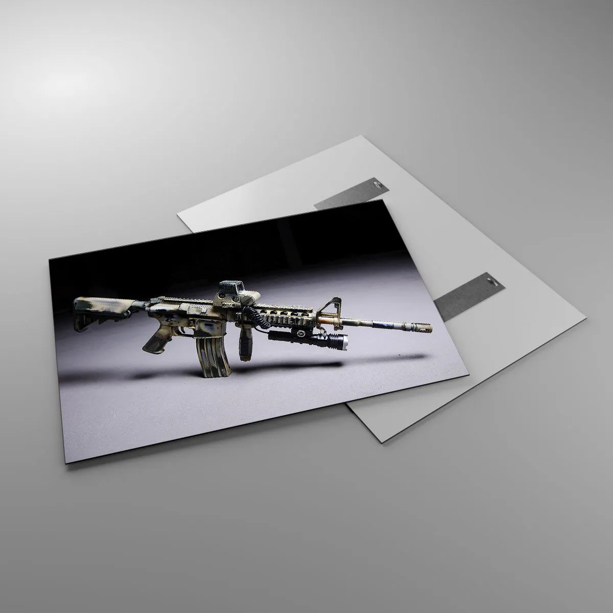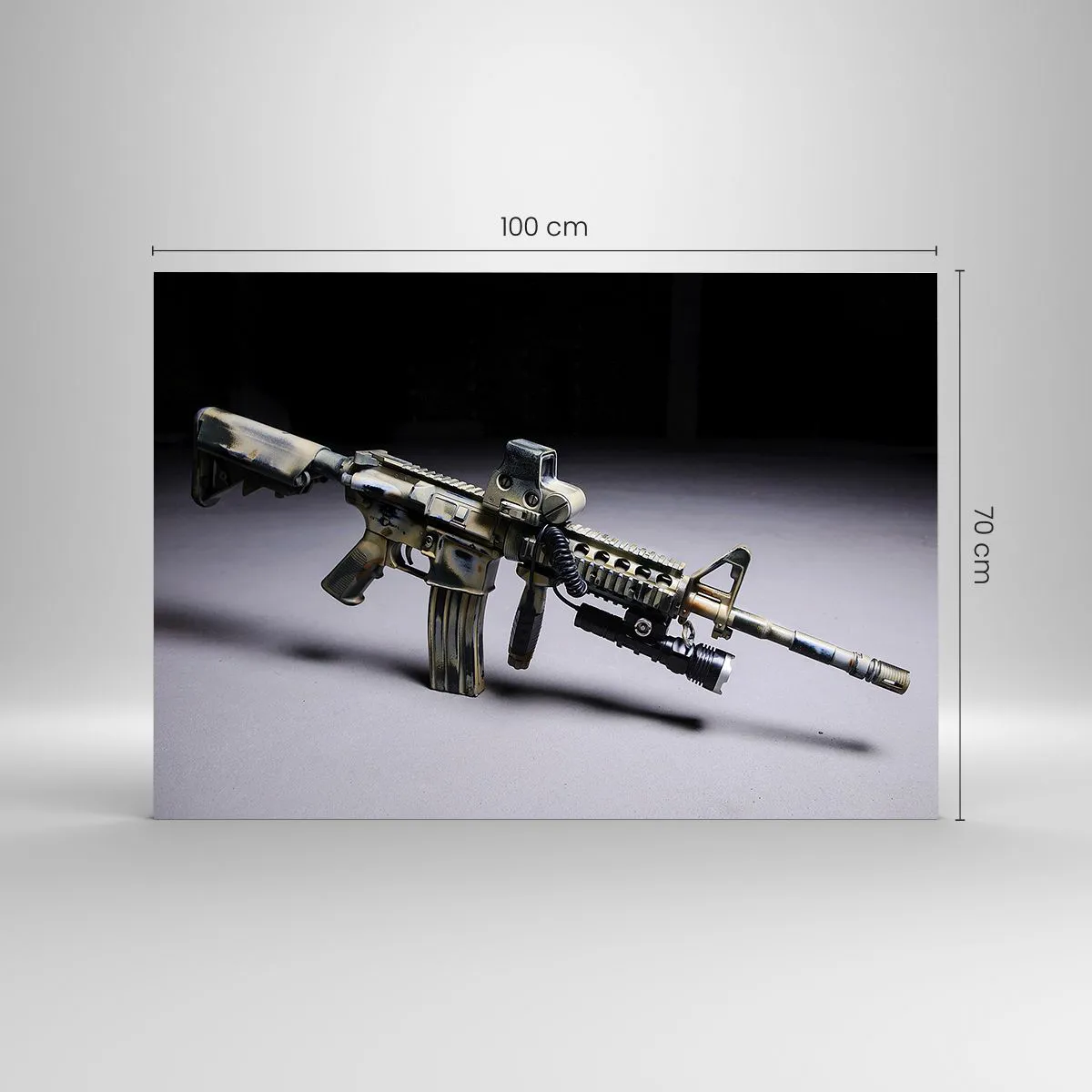 Impression sur verre - Image sur verre - Un fusil moderne sur un fond sombre avec un accent industriel - 100x70cm - Toujours menaçant - Décoration murale moderne pour le salon et la chambre ARTTOR