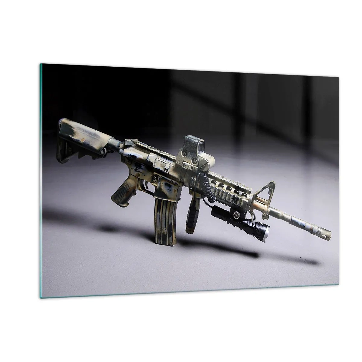 Impression sur verre - Image sur verre - Un fusil moderne sur un fond sombre avec un accent industriel - 120x80cm - Toujours menaçant - Décoration murale moderne pour le salon et la chambre ARTTOR